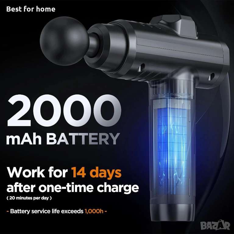 Супер дълготрайност и LCD сензорен екран: Сензорни бутони за регулиране на скоростта на масажа и показване на точна електрическа мощност и ниво на масаж в реално време. Батерията може да поддържа непрекъсната работа 15 дни с 20 минути на ден. Нашият масажен пистолет е оборудван с USB Type-C зареждане. Няма нужда да се притеснявате за зареждането, когато пътувате с него в различни страни.