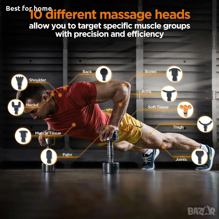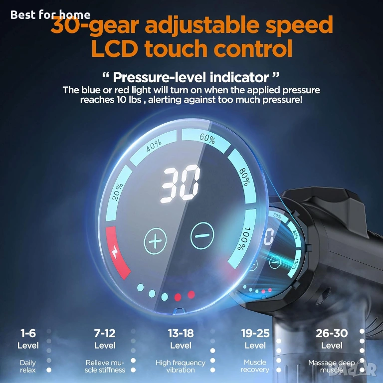 Ръчен пистолет за дълбок мускулен масаж: Предава високоскоростни импулси на налягане към мускулните тъкани, за да постигне перфектен масажен ефект, да премахне болката, сковаността и дискомфорта, да възстанови най-доброто мускулно състояние за служители, работници, спортни ентусиасти или възрастни хора, така че всички хора, страдащи от мускулен дискомфорт, да могат да се насладят на голямо мускулно облекчение. Много подходящ е за масаж на гърба, раменете, ръцете, краката и мускулите.