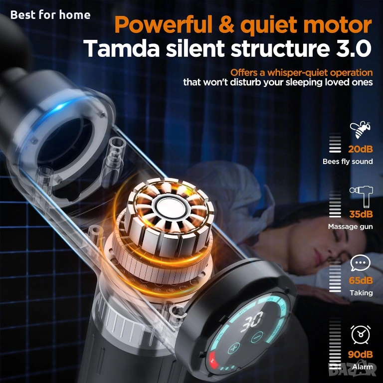 Преносим и ултра тих масажен пистолет: Технологията QUIET POWER MOTOR 3.0 в комбинация с безшумната релсова структура може да гарантира, че шумът никога няма да надвишава 35dB, дори при най-високата скорост от 3200 почуквания в минута. Можете да се чувствате комфортно, когато използвате в офиса или във фитнеса, и дори спящите членове на семейството до вас никога няма да бъдат обезпокоени. Можете да го носите, за да го използвате навсякъде, за да се отървете от мускулния дискомфорт по всяко време.