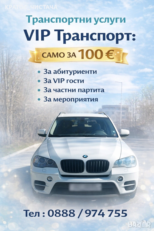 Транспортни услуги VIP Транспорт: • За абитуриенти • За VIP гости • За Частни партита • За ралични мероприятия САМО ЗА 100 € За информация и резервации се обадете на посочения телефон. 0888 97 47 55
