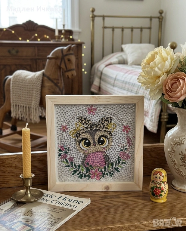 Продавам уникално пано – ръчно изработен диамантен гоблен с изображение на совичка. Изключително прецизна изработка с внимание към всеки детайл.