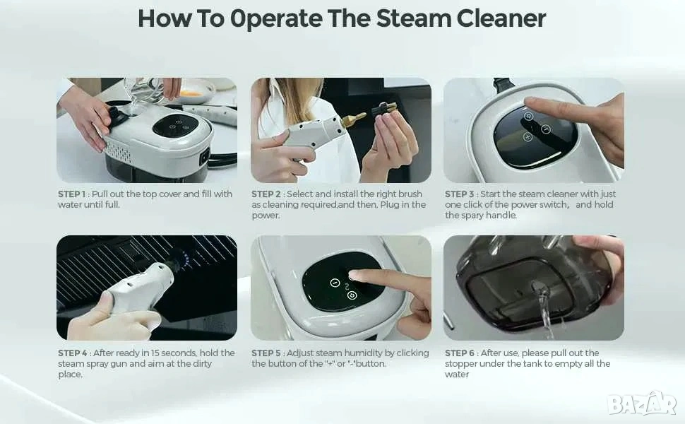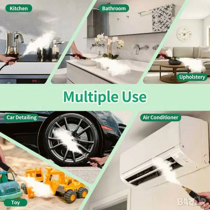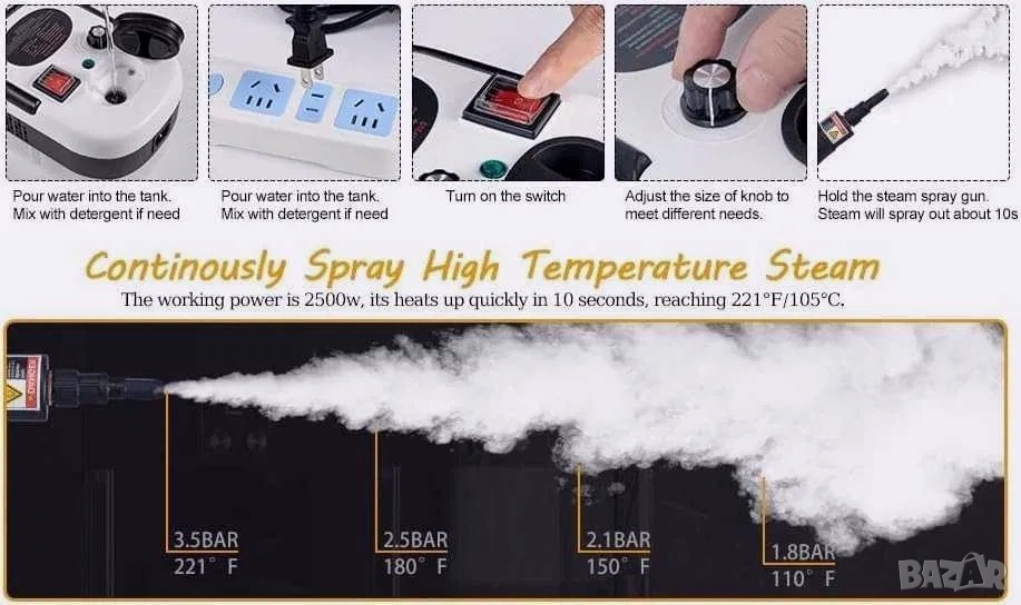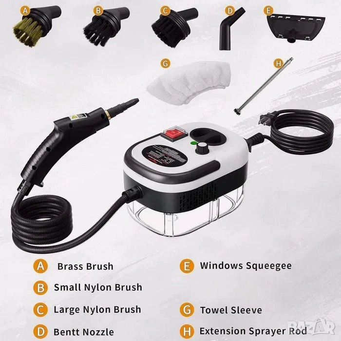 7 В 1 ръчен почистващ препарат за пара. Има 7 накрайника. Генериране на пара до 105 градуса по Ц елзий/221 градуса по Фаренхайд 3 бара за 15 секунди, способни да почистват и премахнат мазнините, мръсотията, праха и петна от широк спектър от повърхности