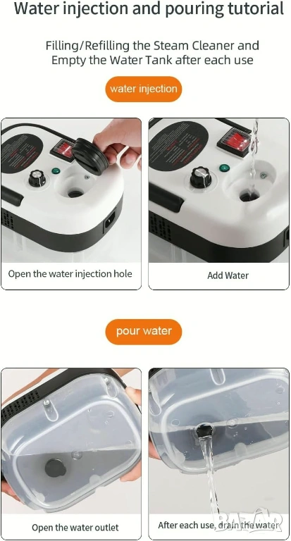Лесен за работа : Просто добавете достатъчно вода в резервоара и включете превключвателя, за да започнете да почиствате. Можете да контролирате входа на водата, като завъртите копчето, за да регулирате изхода на парата. Спестява повече вода, отколкото традиционното почистване на ръчно измиване