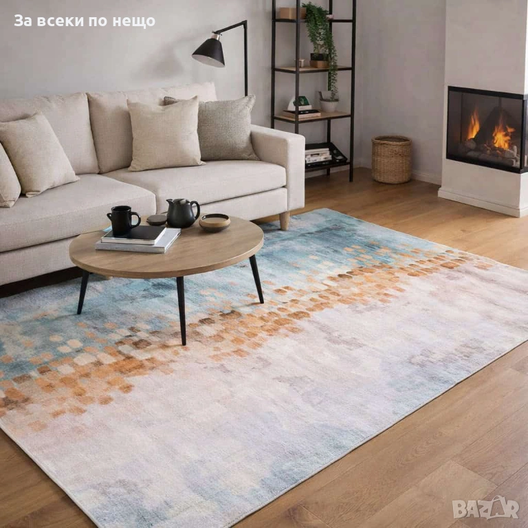 Модерен щампован килим в елегантна комбинация от синьо, бежово и топли земни нюанси. Абстрактният дизайн създава усещане за дълбочина и спокойствие, което го прави идеален избор за хол, спалня или съвременен офис.