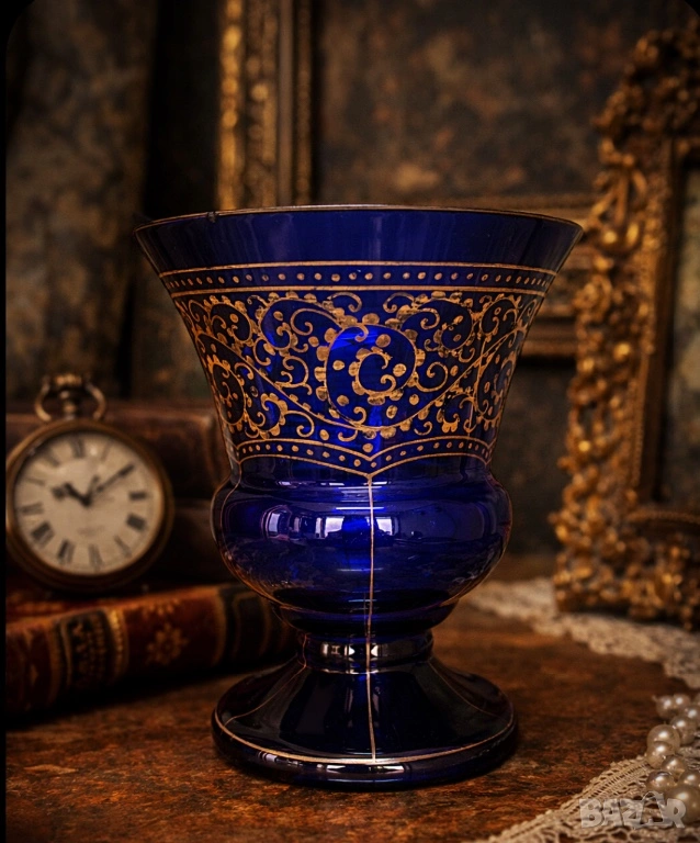 Елегантна ваза от кобалтово синьо стъкло, богато украсена с изящни сребристи орнаменти. Изработена с внимание към детайла, тя съчетава класически стил и изтънчена визия, подходяща както за декорация, така и за колекционери.