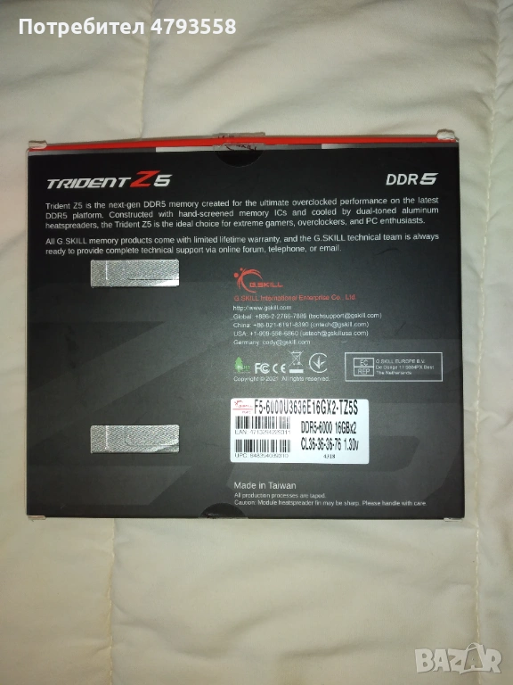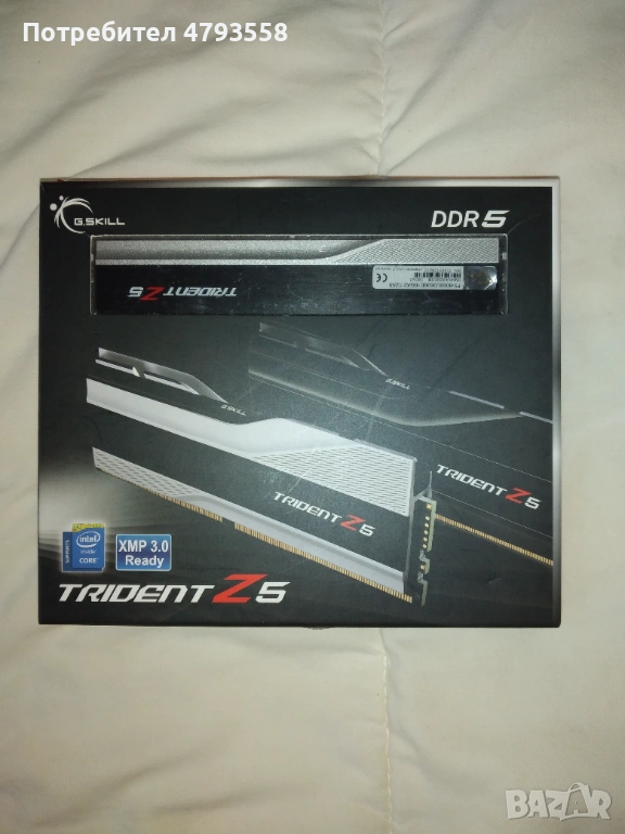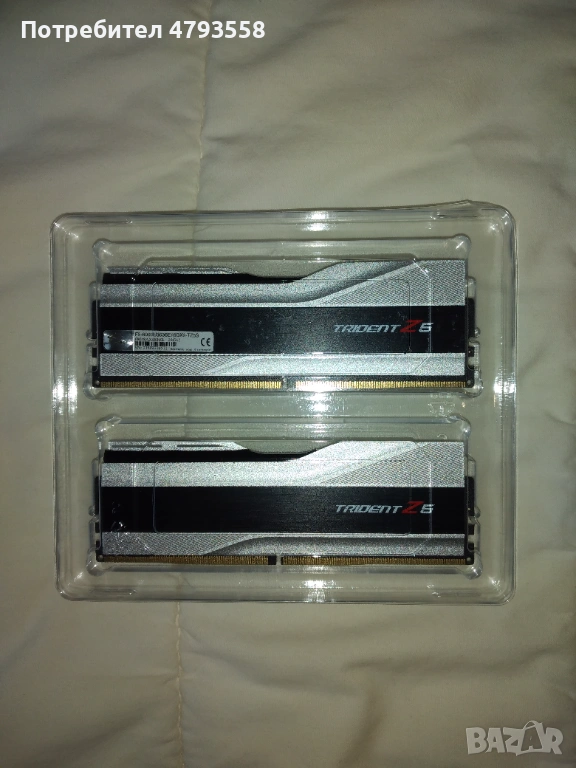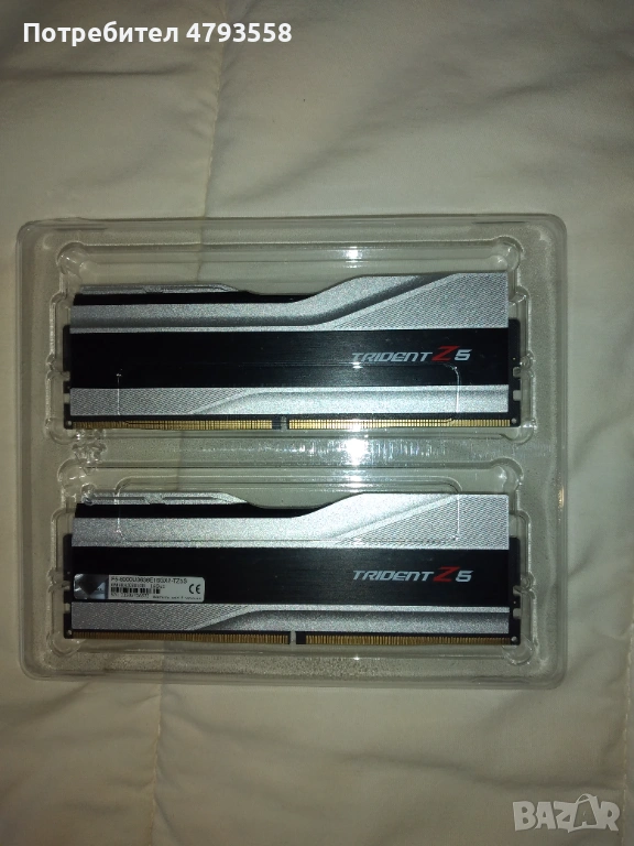 Продавам употребявана RAM памет марка G.Skill модел Trident Z5 F5-6000U3636E16GX2-TZ5S 32 GB (2 плочки по 16 GB DDR5), честота 6000 MHz, латентност CL 36-36-36-76, 1.30V, без RGB. Комплектът е закупен на 06.01.2022 г. от украинска фирма, като има остатъчна гаранция до 06.01.2027 г., а именно: 9 месеца. Оперативната памет е в перфектно техническо и външно състояние, неразличимо от ново – в пълен комплект, като реално е използвана около 8 (осем) месеца. Продава се само комплект, не по единично. Не проявявам интерес към бартери.