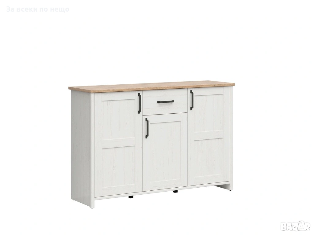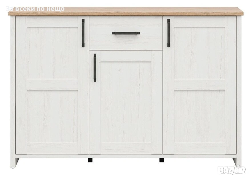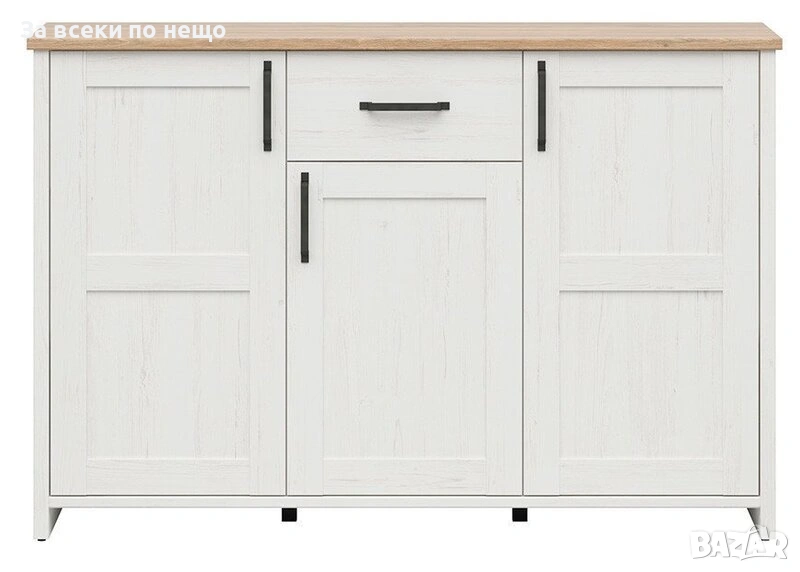 Скринът от серията Loksa е практично предложение за Вашата дневна или спалня. Комбинацията между бял бор андерсън и дъб грандсон освежават интериора. Допълнително предимство на скрина е и механизмът за плавно затваряне на чекемджето и вратичките. Черните метални дръжки служат за акцент и улеснение при ежедневна употреба.