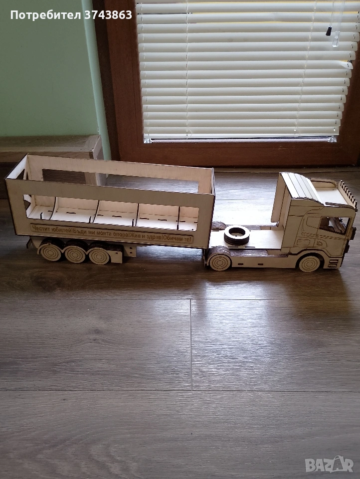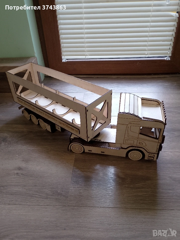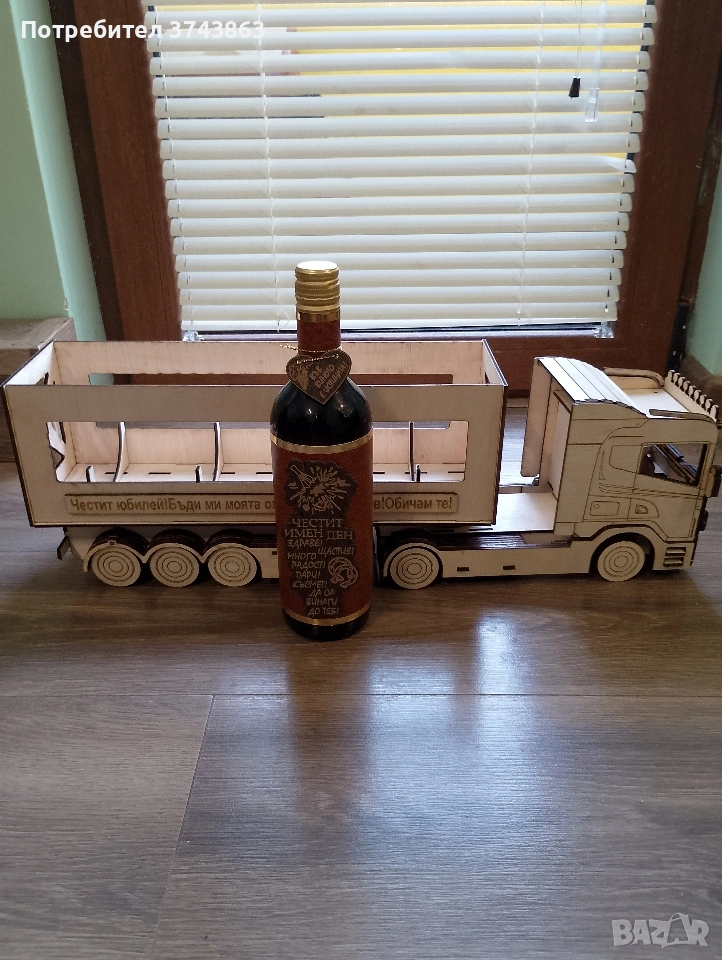 Дървен камион за превоз на бутилка. С възможност за гравиране на текст по избор на клиента. Дължина около 60 см. Срок за изработка 3 дни