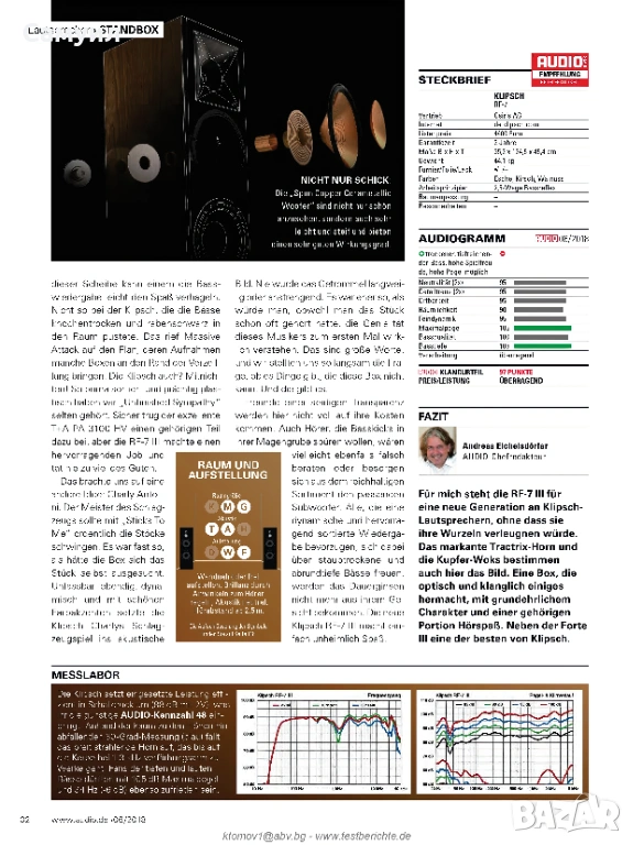 За да не оставаме само с празни приказки срещу твърденията на британските експерти, ще се позовем на обективността на немската инженерна школа и на коректните измервания в AUDIO (06/2018), от които ясно се вижда, че RF-7 III е рафинирана, неутрална и изключително прецизна колона, което може да се види от тяхното измерване на KLIPSCH RF-7 III, което специално съм приложил като снимка.