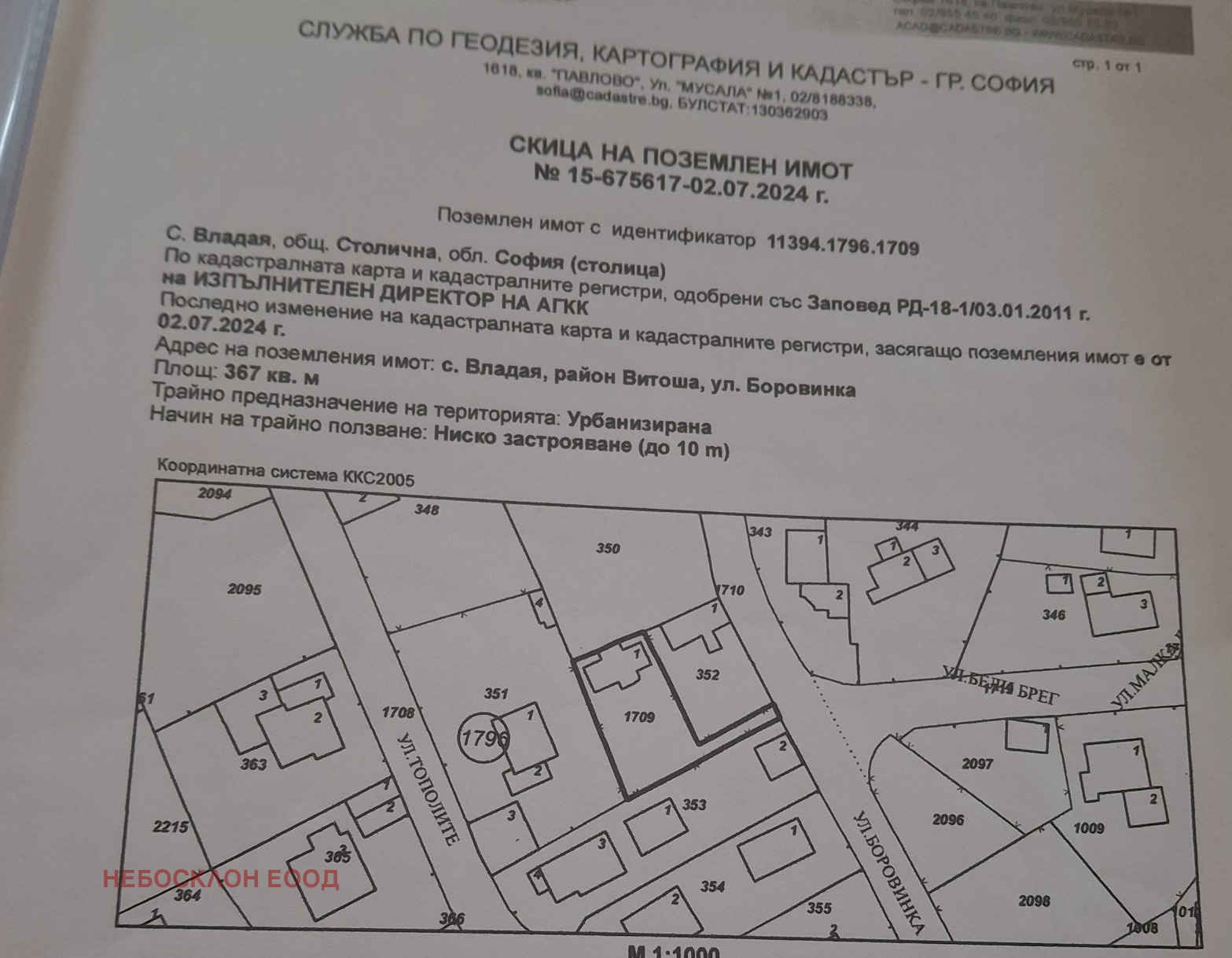 Дворното място е с площ от 367 кв.м и с идентификатор 11394.1796.1709 като не разполага с възможност за паркиране в него към момента-паркирането е свободно пред парцела.