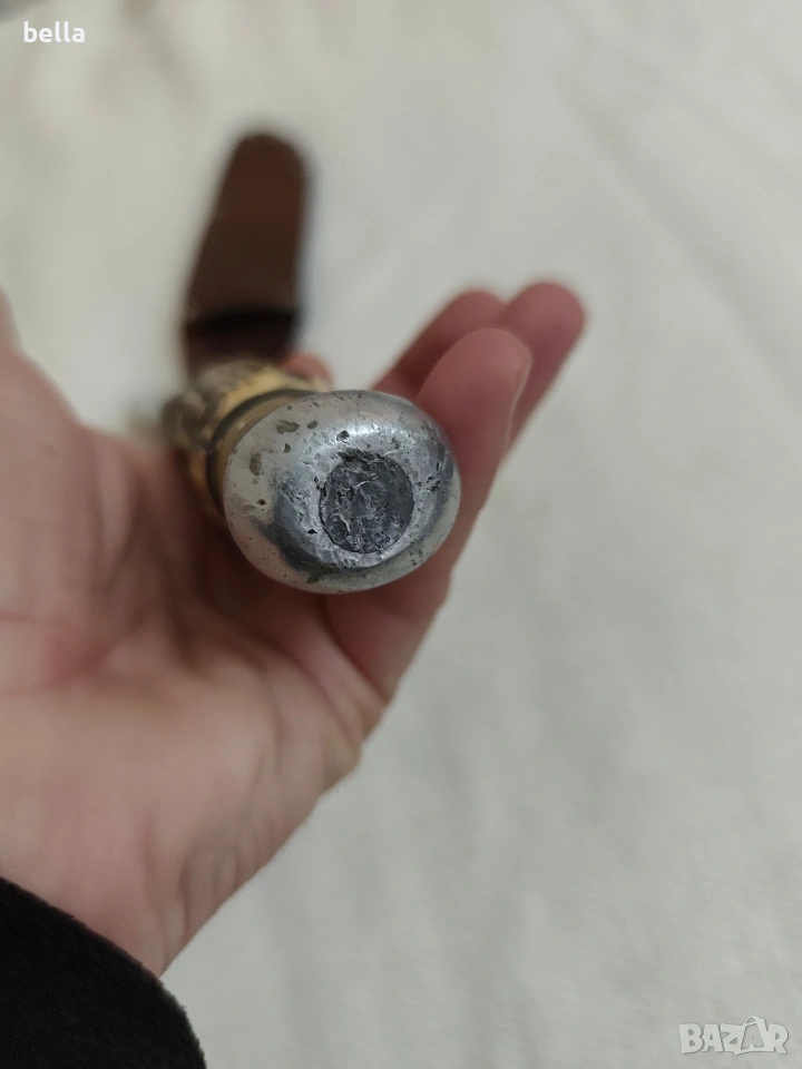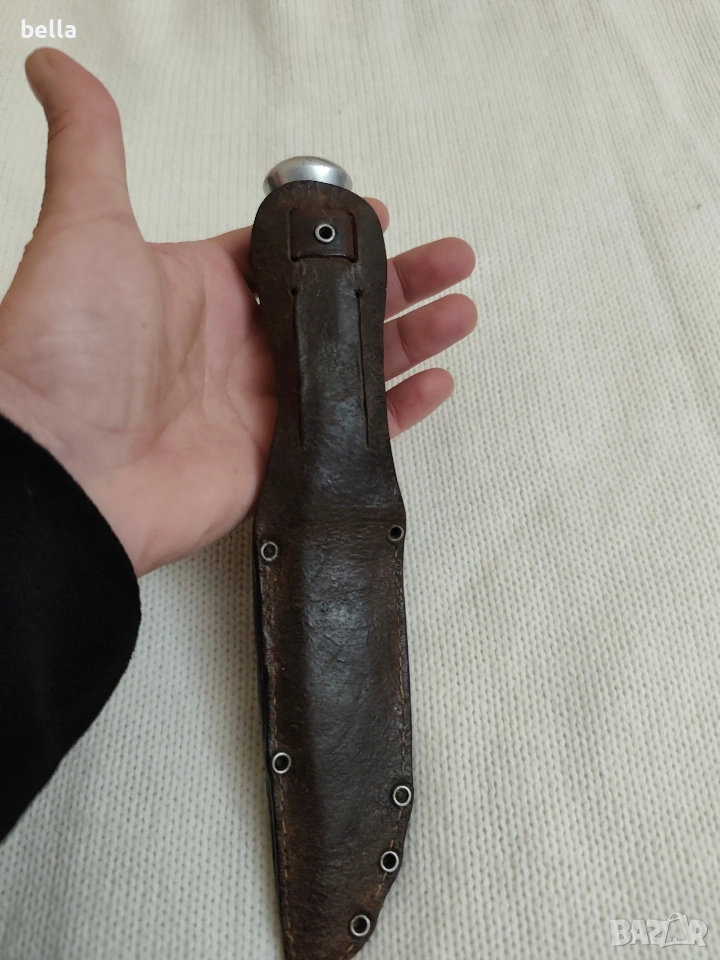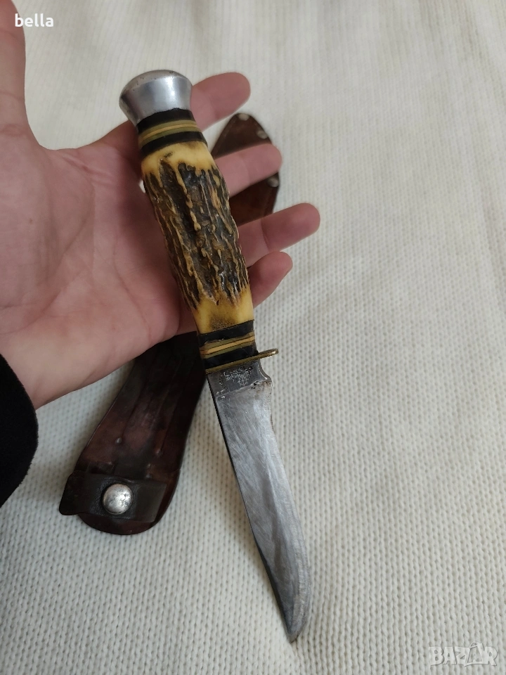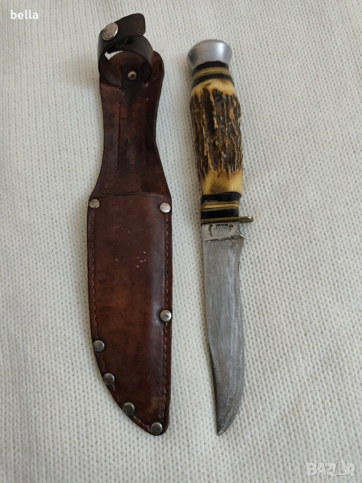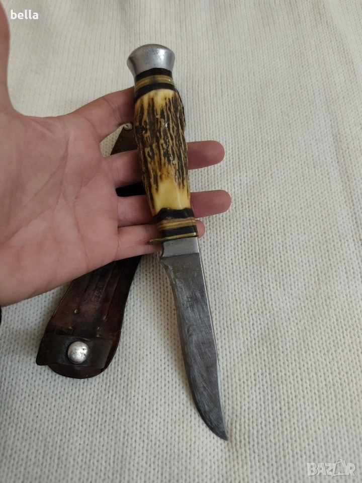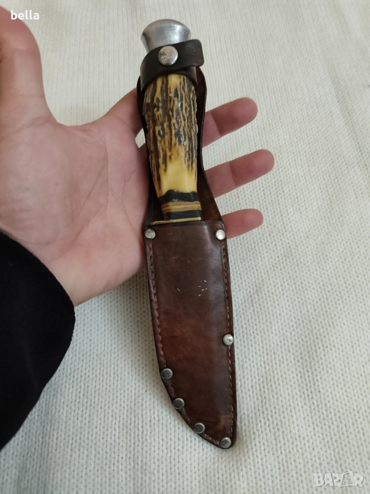 Рядък Немски Ловен Нож Hubertus Solingen – Еленски Рог. Автентичен немски ловен нож от висок клас, произведен от легендарната марка Hubertus Solingen. Ножът е класически модел, изключително ценен от колекционери и ценители на традиционното немско качество. Solingen, Germany .Острие: Изработено от неръждаема стомана (Rostfrei), с маркировка на производителя и характерното лого с котва.Дръжка: Естествен еленски рог с уникален релеф, месингов гард и масивен алуминиев помел.Кания: Оригинална кания от естествена кожа с подсилени нитове.Състояние: Ножът е в добро автентично състояние с нормални следи от времето, които му придават характер. Острието е здраво и стабилно.Цена 125 евро