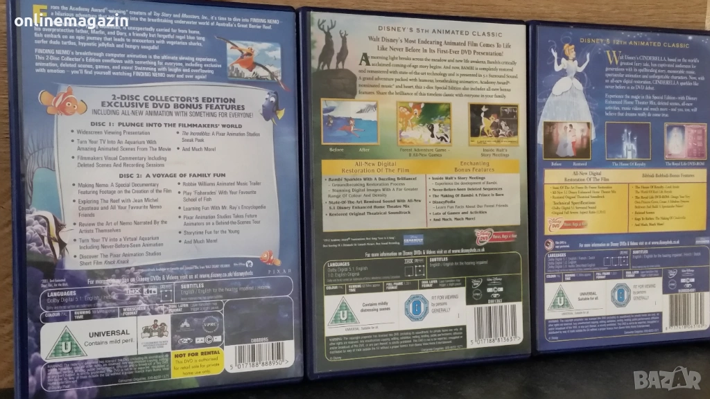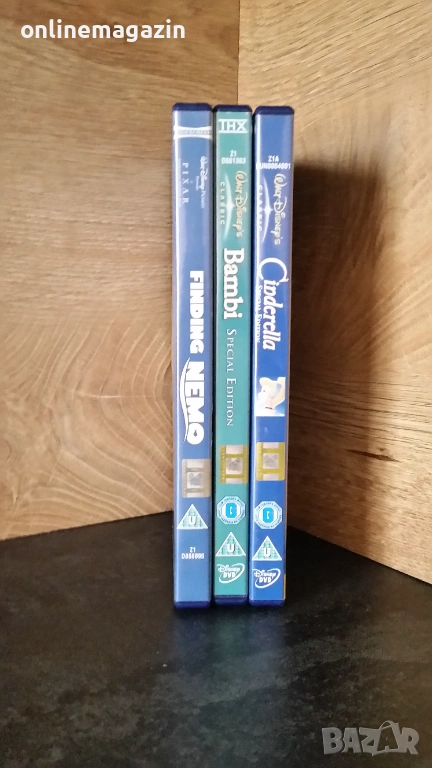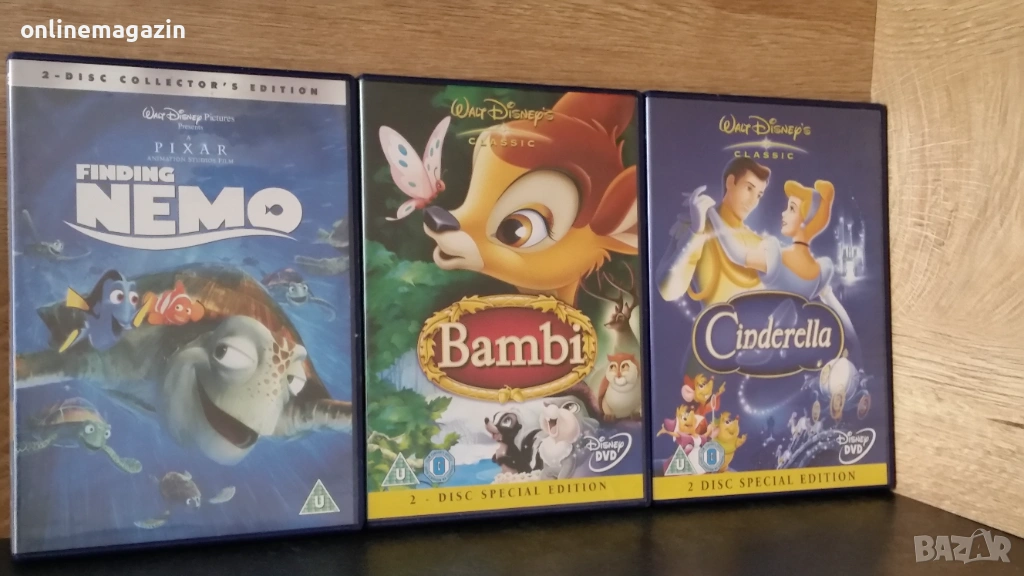 Продавам 3 DVD анимации на Disney с по два диска в опаковка . В търсенето на Немо, Бамби и Пепеляшка. Анимациите са на английски език и са неразличими от чисто нови . Без никакви следи от употреба. Продават се заедно. Изпращам с Еконт, Спиди или лично предаване за град Бургас. Цена 15 евро за трите анимации.