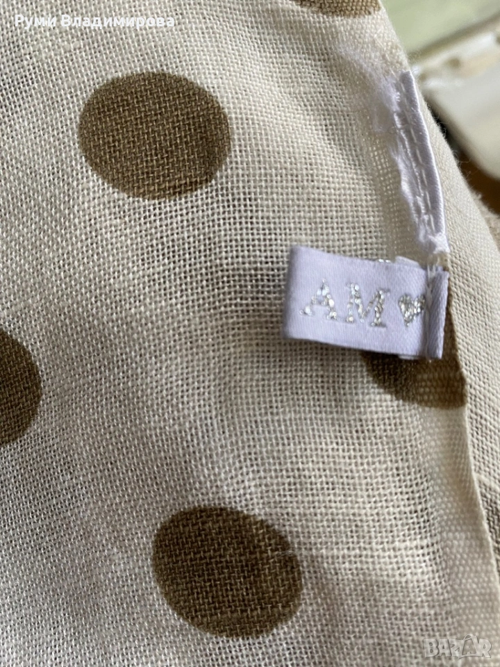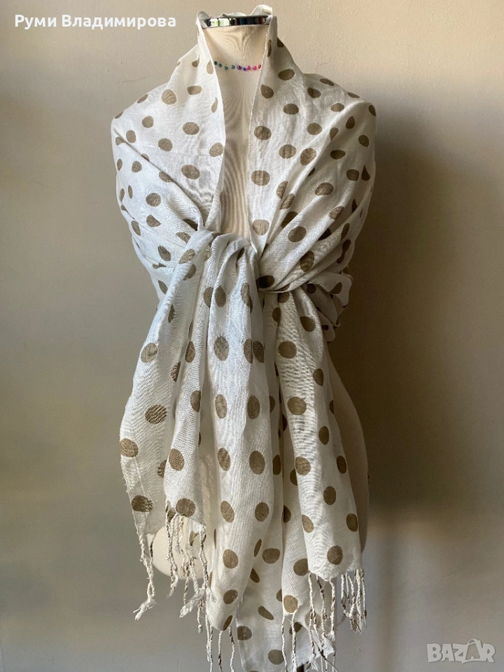 Бял шал на бежови точки, материя вероятно памук и лен, мека и пада леко, без етикет, с ресни, за любители на точките, доставка с Еконт, цена 15€.