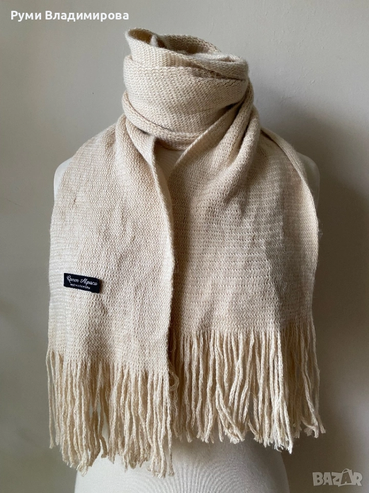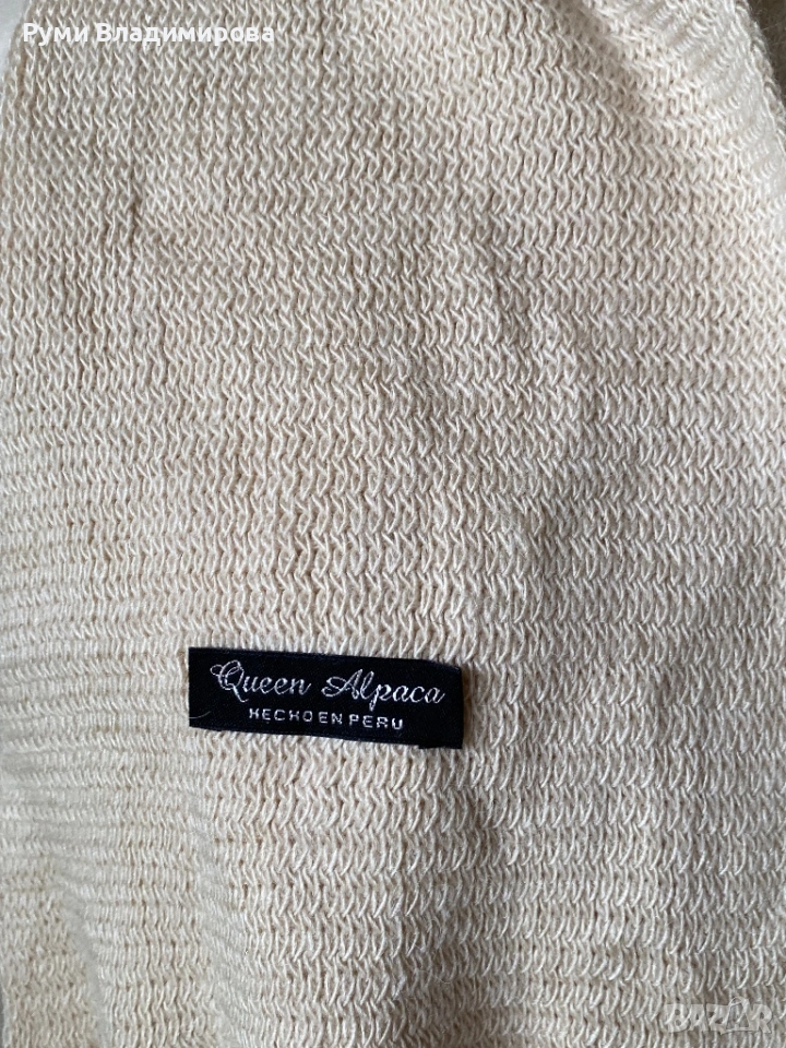 Бежов шал от Alpaca, с ресни, направен в Перу, на етикета Queen Alpaca, много нежен бледо бежов цвят и пухкава материя от най висок клас, доставка с Еконт.