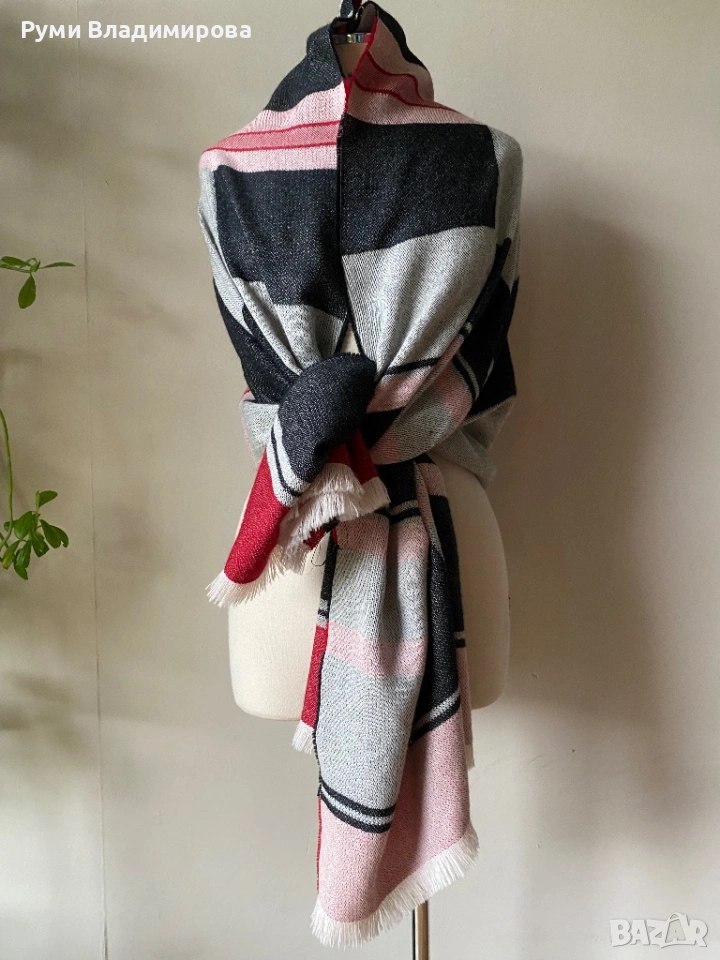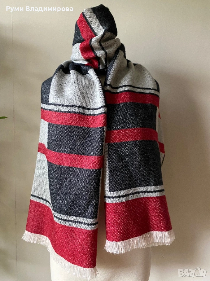 Голям шал в сиво и червено от 100 % baby alpaca, направен в Перу, размер 69 Х 105 см/ тип одеало, изключителна мека, топла и от най- висок клас материя. Доставка с Еконт. Цена на този 25€.