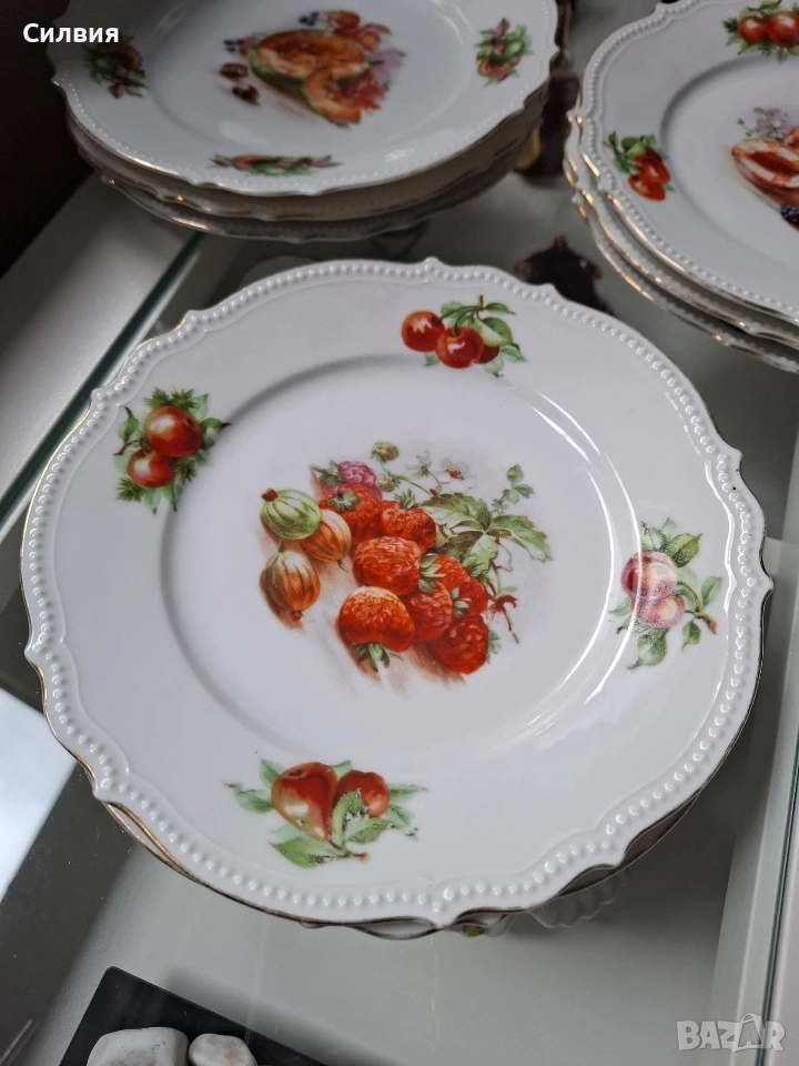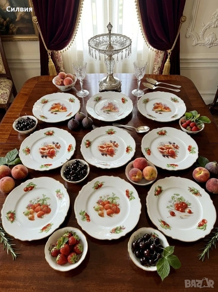 Всяка чиния е украсена с изящни плодови натюрморти – праскови🍑, ягоди🍓, череши🍒 и пъпеши🍈, изпълнени с богата наситеност на цветовете и невероятна детайлност. Композициите са заобиколени от малки флорални акценти по периферията, които допълват хармонията на дизайна.