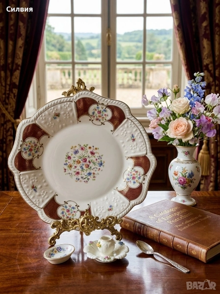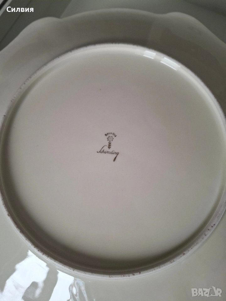 Антикварно порцеланово плато Lindner Bavaria – 32 см (ок. 1955–1965 г.) Изключително елегантно голямо плато от фин порцелан с красив релефен декор. 📅 Период: около 1955–1965 г. (според оригиналната маркировка на дъното) 📏 Диаметър: 32 см 🎨 Цвят: слонова кост Платото се отличава с изящен и богат декоративен стил. Периферията е оформена с релефни орнаменти и редуващи се панели в дълбок бордо нюанс със златисти акценти. Фините флорални мотиви в пастелни цветове са разположени както по ръба, така и в центъра, където оформят нежен букет с класическа естетика. Формата е вълнообразна с прецизно изработен релеф, типичен за високия клас порцелан от средата на XX век. ✨ Подходящо както за сервиране, така и като декоративен акцент – идеално за витрина, класически интериор или подарък за ценители и колекционери. 📌 Състояние: Много добро винтидж състояние.