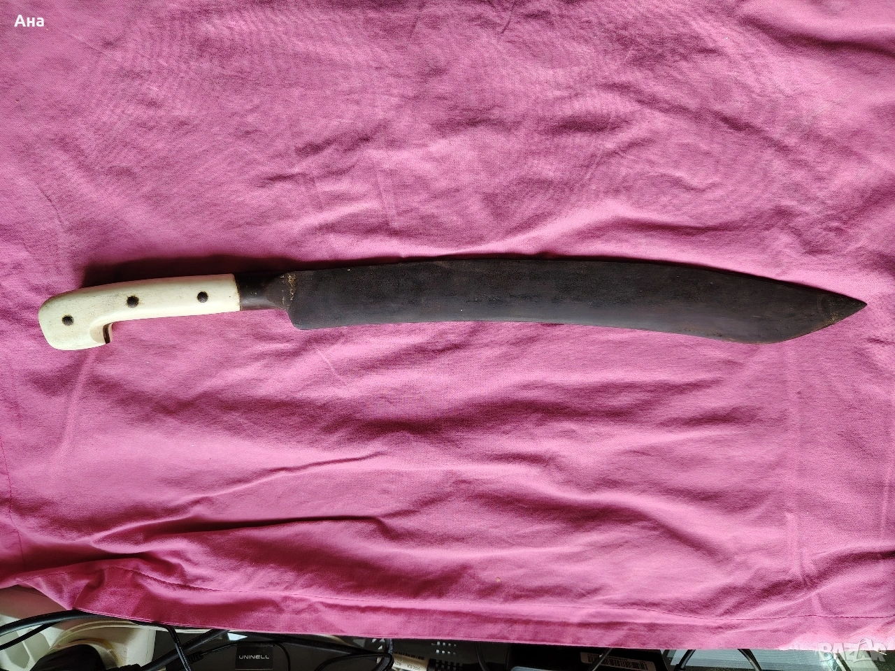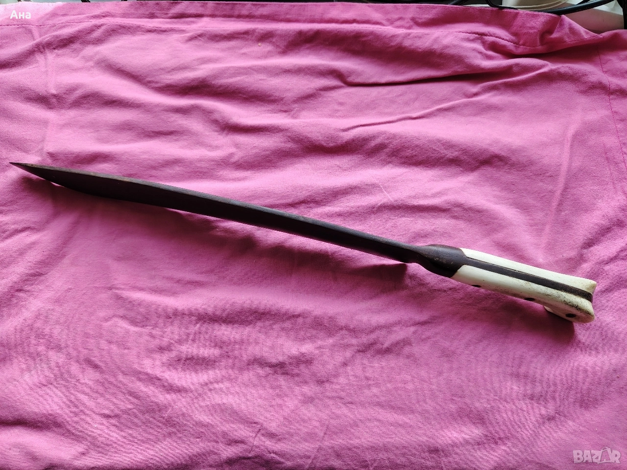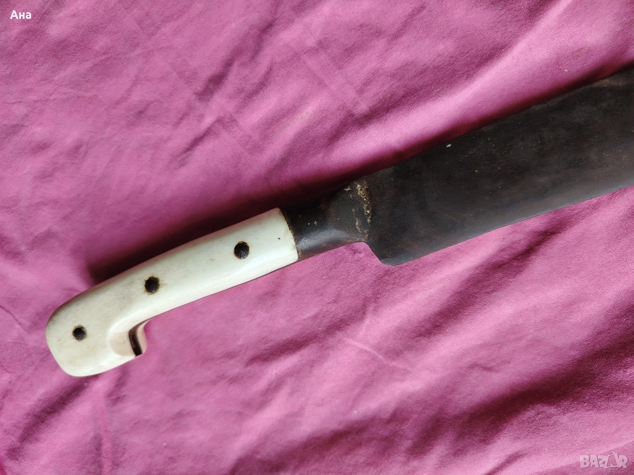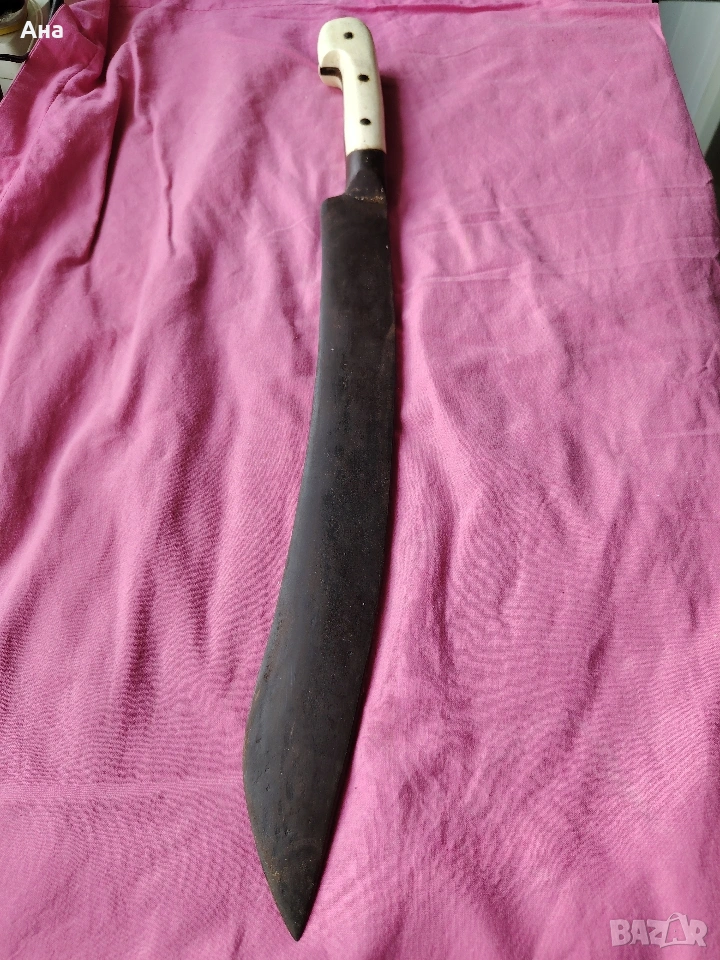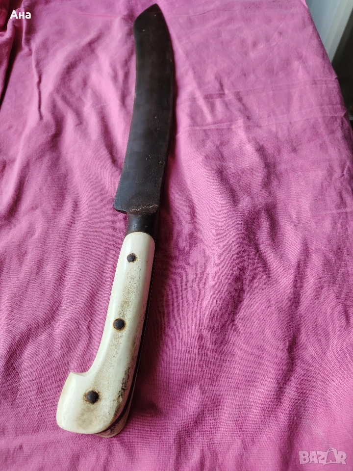 Не са правени абсолютно никакви реставрации по ножа, острието е ковано, чирените са от кост, никъде няма пукната или отчупено по дръжката Обща дължина 49 см.