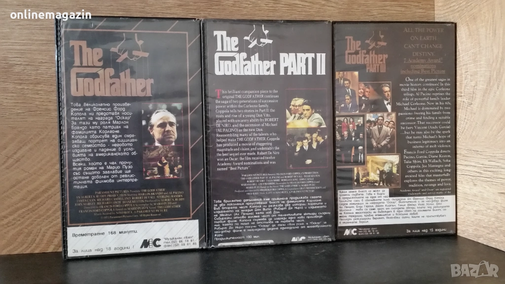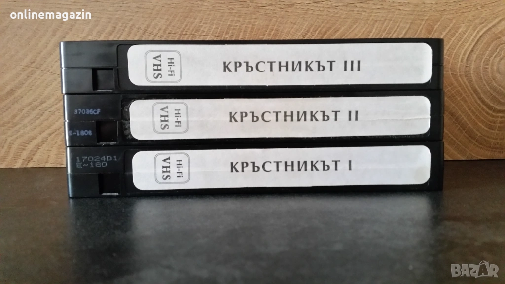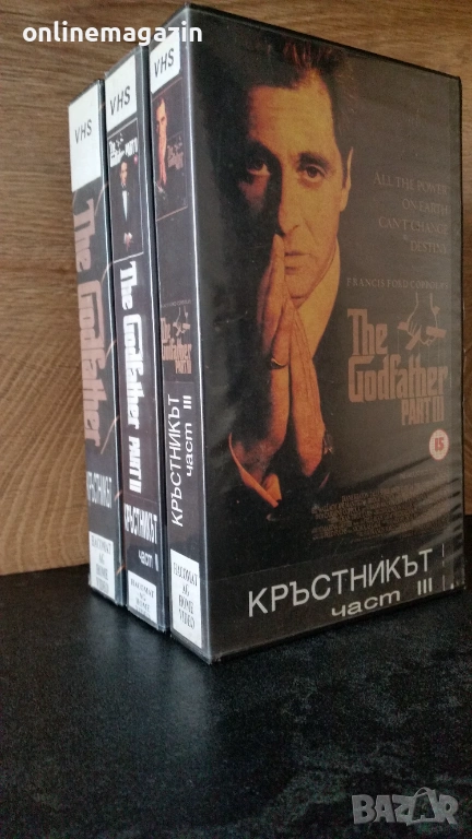 Продавам видеокасети КРЪСТНИКЪТ ТРИЛОГИЯ . Касетите работят отлично и са озвучени на български език със страхотен дублаж. 15 снимки на обявата и 11 снимки на касетите в работещо състояние. Продават се заедно. Цена 30 евро. Изпращам с Еконт, Спиди или лично предаване за град Бургас.