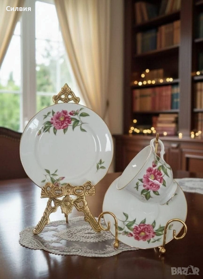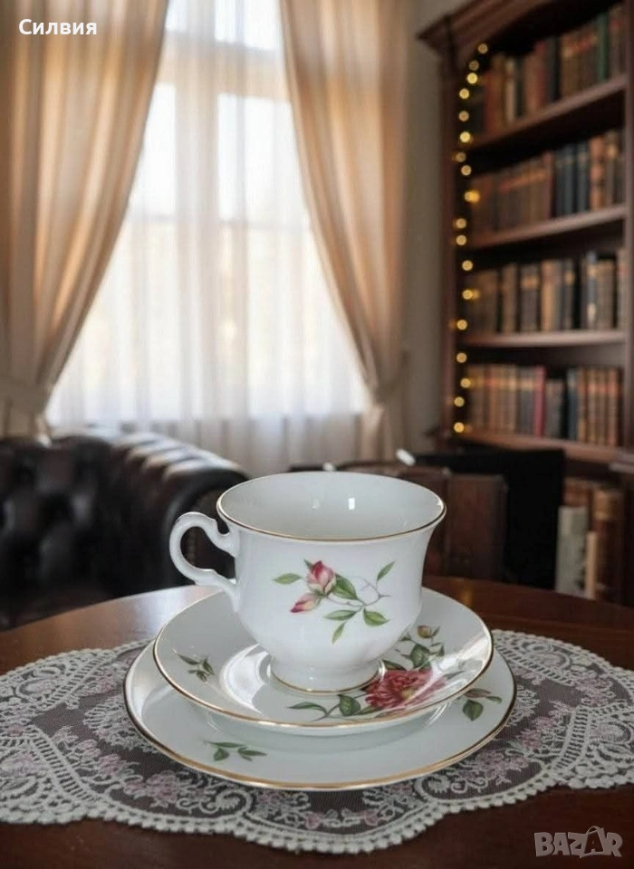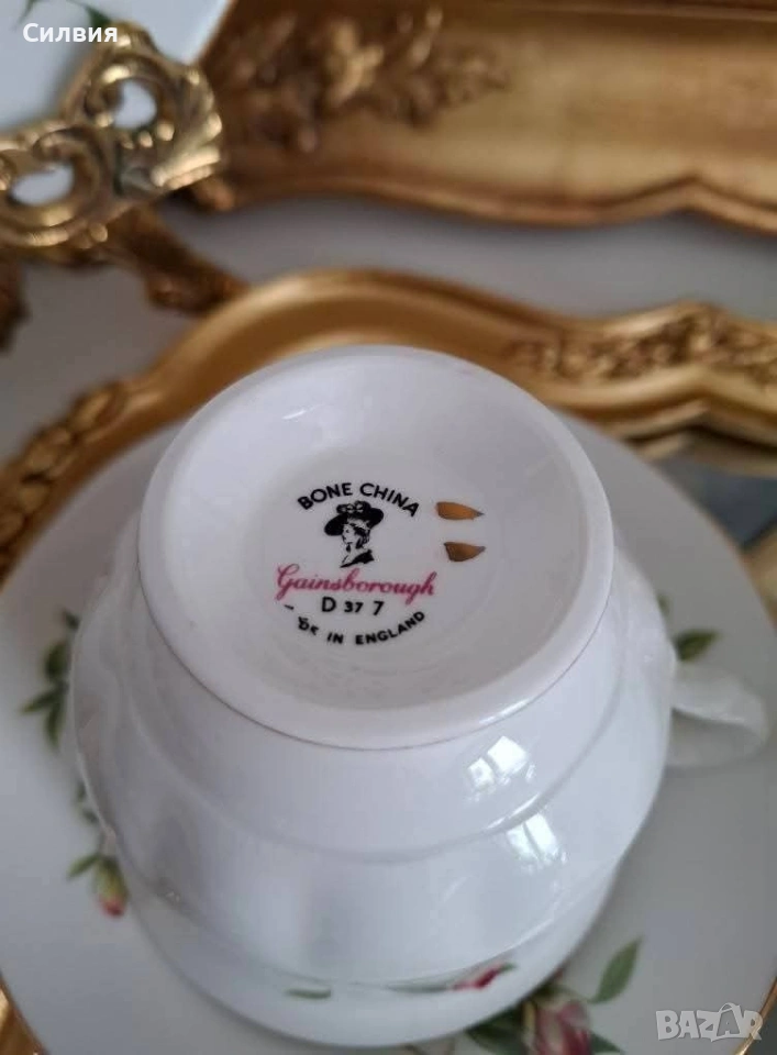 Винтидж трио от костен английски порцелан, Gainsborough от 50-те години (1950-1959) Цветен декор- розов божур. Златен кант. Гейнсборо е малка фирма в Лонгтън, която е закрита през 50-те г. ●Чинийки-16 и 14см. ●Чаша с вместимост 200мл. ●Леко изкривяване на подложната чинийка. Цена 2️⃣5️⃣€ 48,90лв 🌷 ೋ🌷 ೋ🌷 ೋ🌷 ೋ🌷