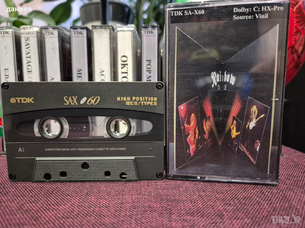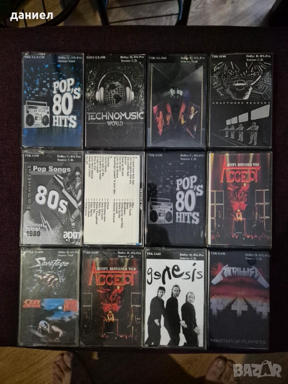12 бр. качествени аудио касети TDK, MAXEL, SONY и HITACHI - всичките TYPE II - хромна лента! Касетите са запазени, записите са с много добро качество, повечето оригинални обложки на касетите са налични! Записите са качествени - Genesis, Rainbow, Savatage, Ozzy Osbourne, ACCEPT, Metallica, POP music 80/90-те, Electronic music, Tehno и др. При покупка имайте предвид, че това все пак са използвани касети. Цената за касетите е 60 евро + подарък една по рядко срещана касета SONY WALKMAN 90 - TYPE II - хромна лента (последната снимка). Лично предаване в района на В. Търново, но е възможно е и с куриер при определени условия!