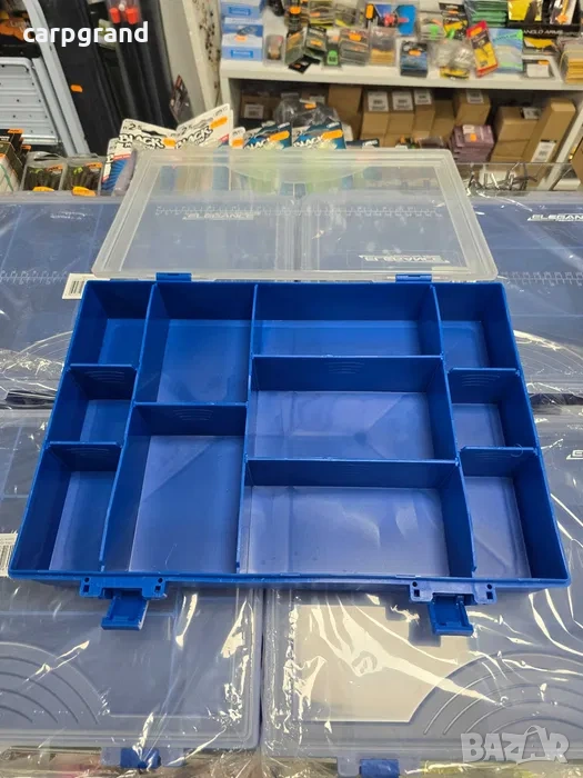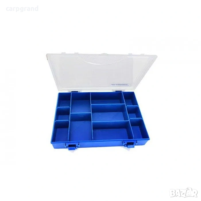 Кутията е качествено изработена и издръжлива, с прозрачен капак, предназначена за съхранение на различни фидер аксесоари като хранители. Размерите й са 34,5 x 25,5 x 6 см и разполага с 4 отделения с подвижни прегради, които позволяват настройка на вътрешното пространство според нуждите. Има надеждно затваряне, което предотвратява случайно отваряне. Размери 34,5 x 25,5 x 6