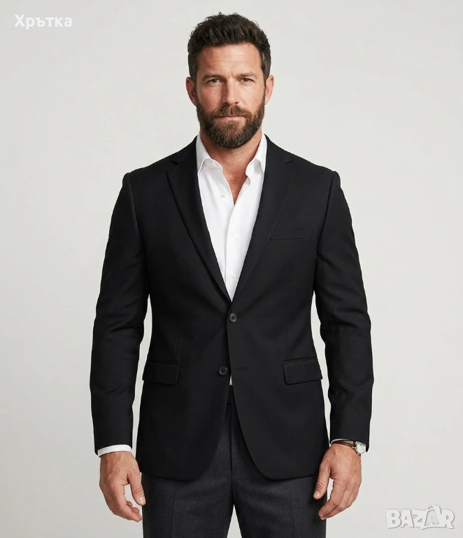 Дизайнът включва два странични джоба с капаци и един горен джоб за кърпичка, придаващи му завършен бизнес и официален вид.
