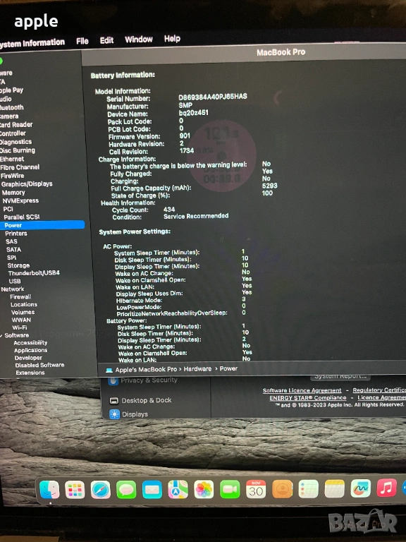 Лаптопът e в безупречно техническо състояние и запазен външно,но с петна по дисплея,които не се отразяват на работата му..В комплект със оригинално зарядно у-во и протектори.Батерията държи над 4ч .Инсталиран Mac OS X.