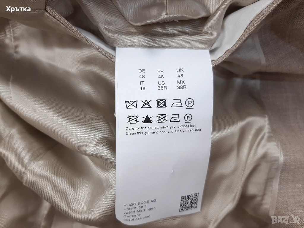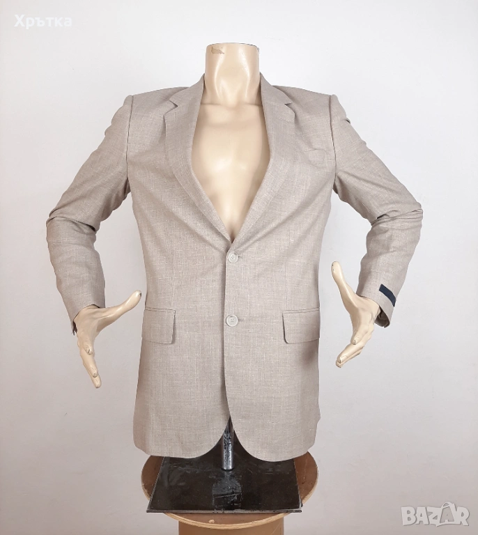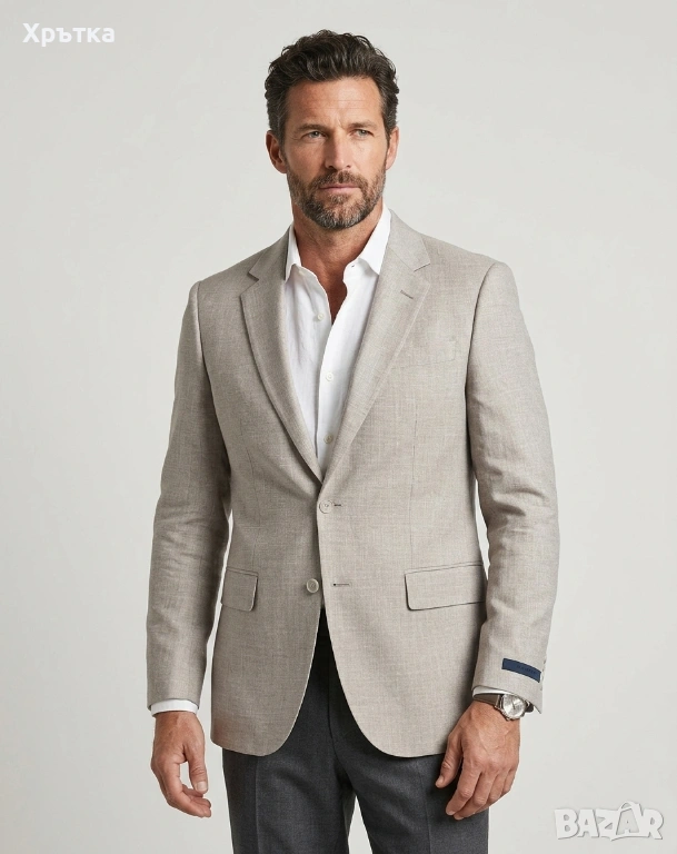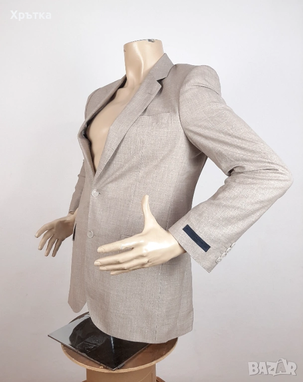 Материята е изключително висок клас микс от вълна, коприна и лен. Тази комбинация придава на сакото уникална текстура, лек естествен блясък от коприната и изключителна проветривост благодарение на лена.