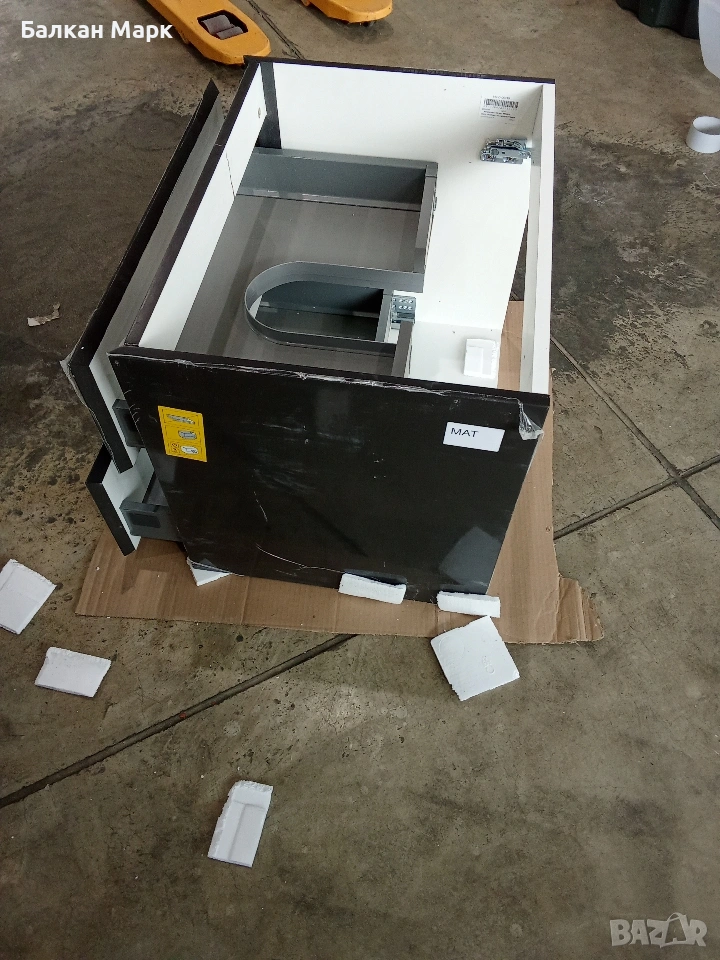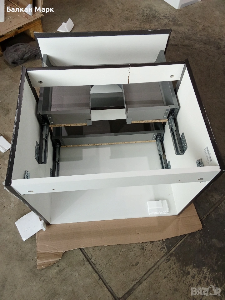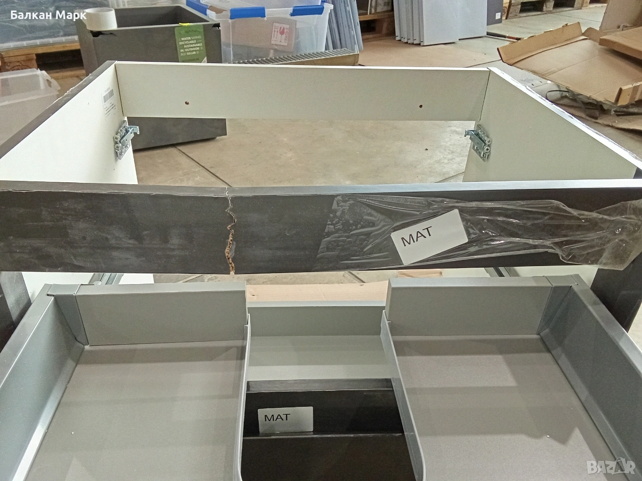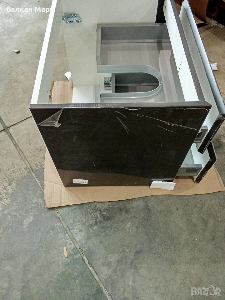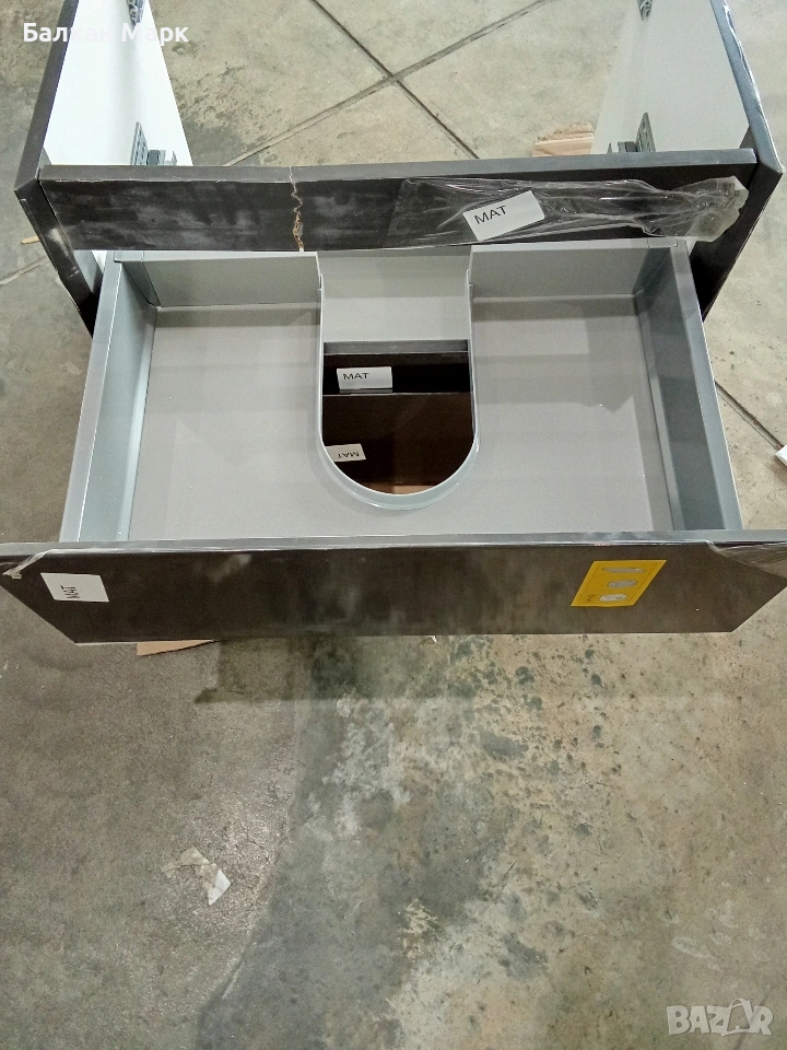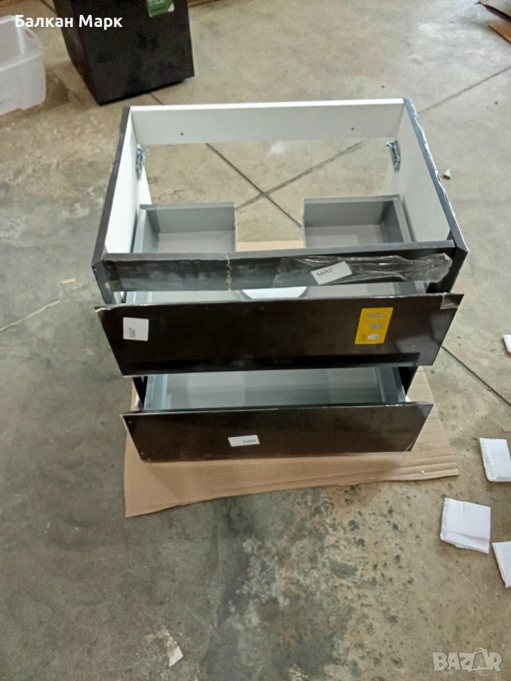 Продавам нов шкаф за баня с две чекмеджета, част от палетирана стока от Германия. Шкафът е с висок клас механизми, но има транспортни дефекти, съобразени с цената.