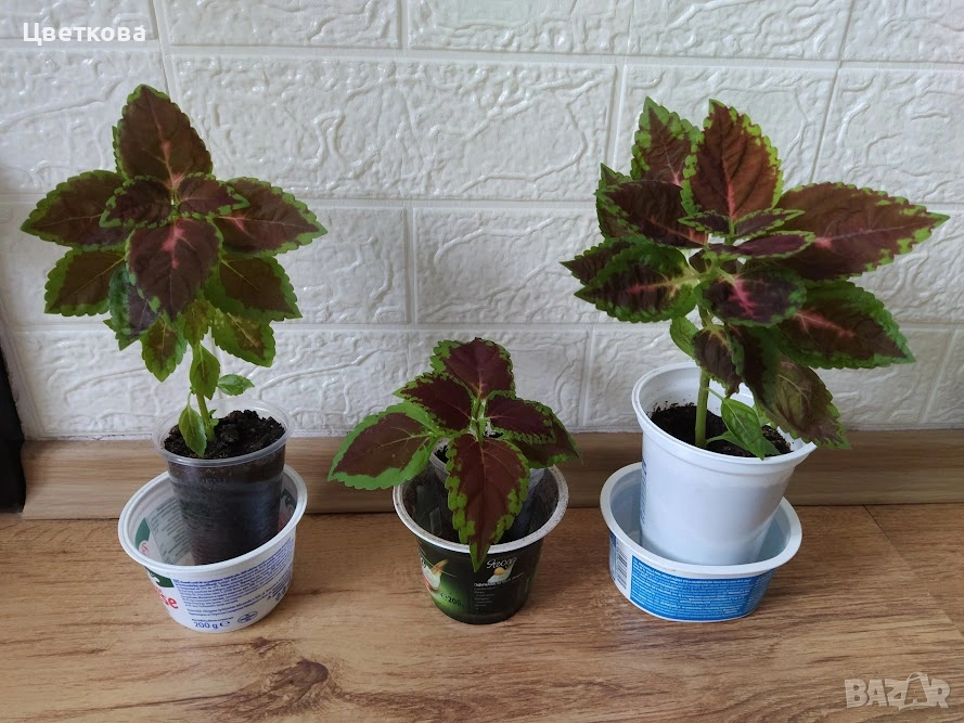 Отлично вкоренени и много лесни за отглеждане и вкореняване копривки, наречени още колеус.Трите са от един и същ нюанс на листата. Не са еднакви по височина