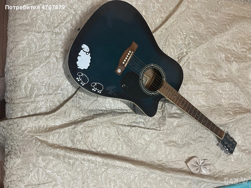 Продавам акустична китара в много добро състояние. Подходяща както за начинаещи, така и за по-напреднали. Китарата е с модерен дизайн в тъмен цвят и стилни декоративни елементи (овчи фигурки), което я прави уникална и различна.
