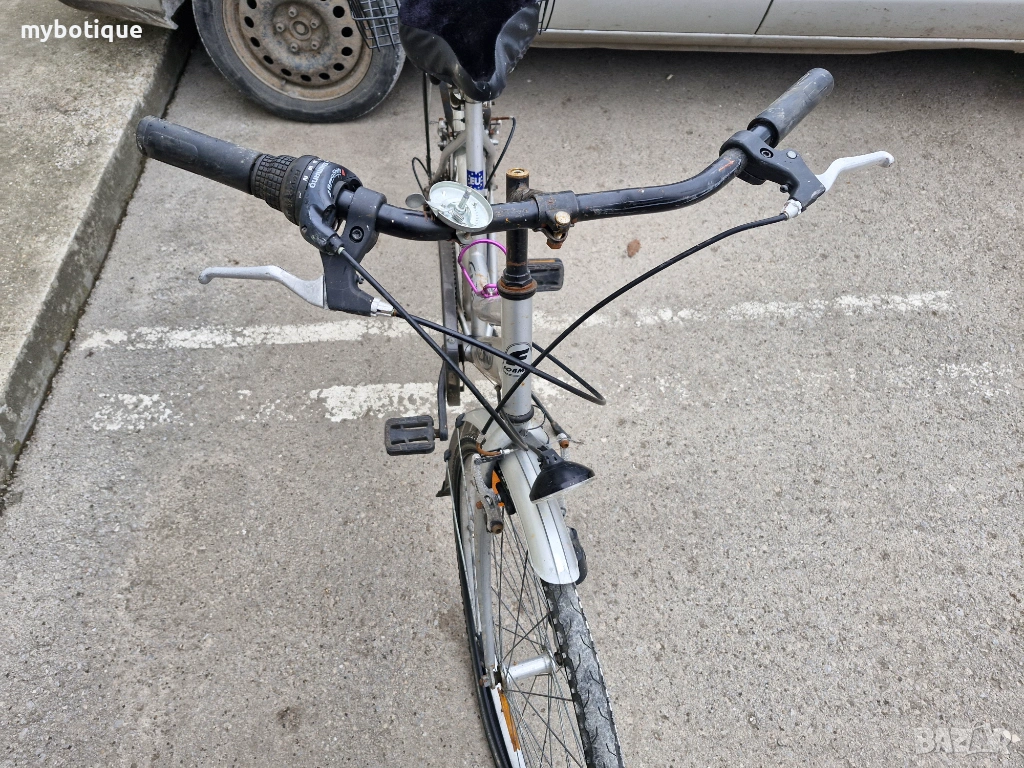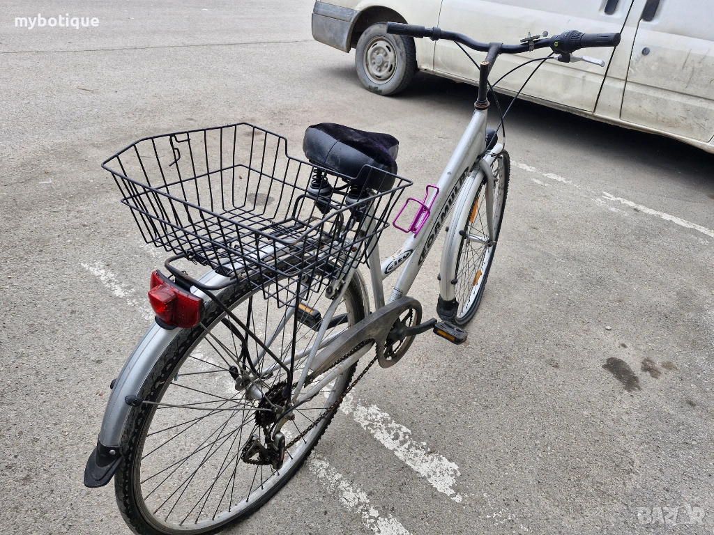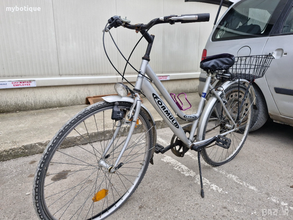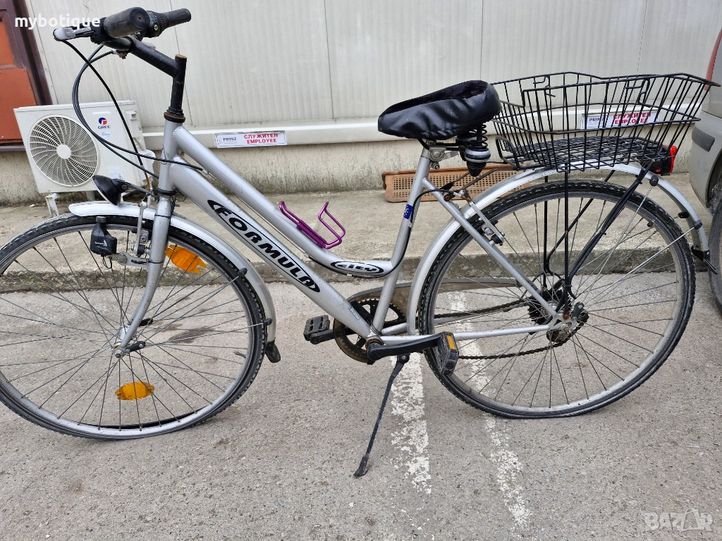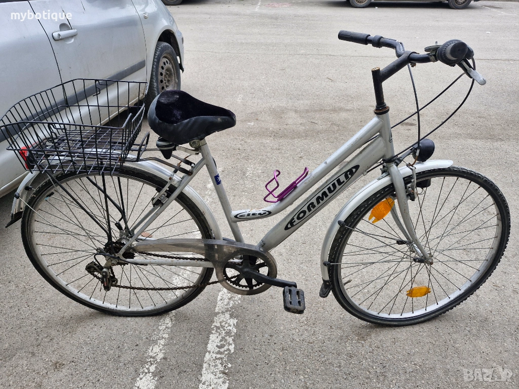Супер оферта 65 €,Този велосипед е модел Formula City, предназначен за градска употреба. Тип: Дамски градски велосипед (City bike) с ниска горна тръба за лесно качване и слизане. Аксесоари: Оборудван е със заден багажник с кошница за багаж, калници, степенка и поставка за бутилка. Дизайн: Сребриста рамка с марката „Formula“ и надпис „City“. Характеристики: Седалката изглежда с допълнително омекотяване за комфорт при градско колоездене.