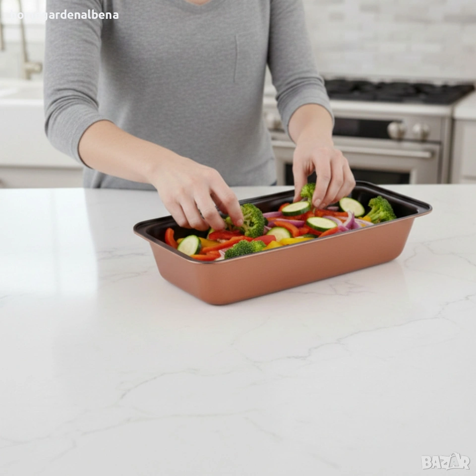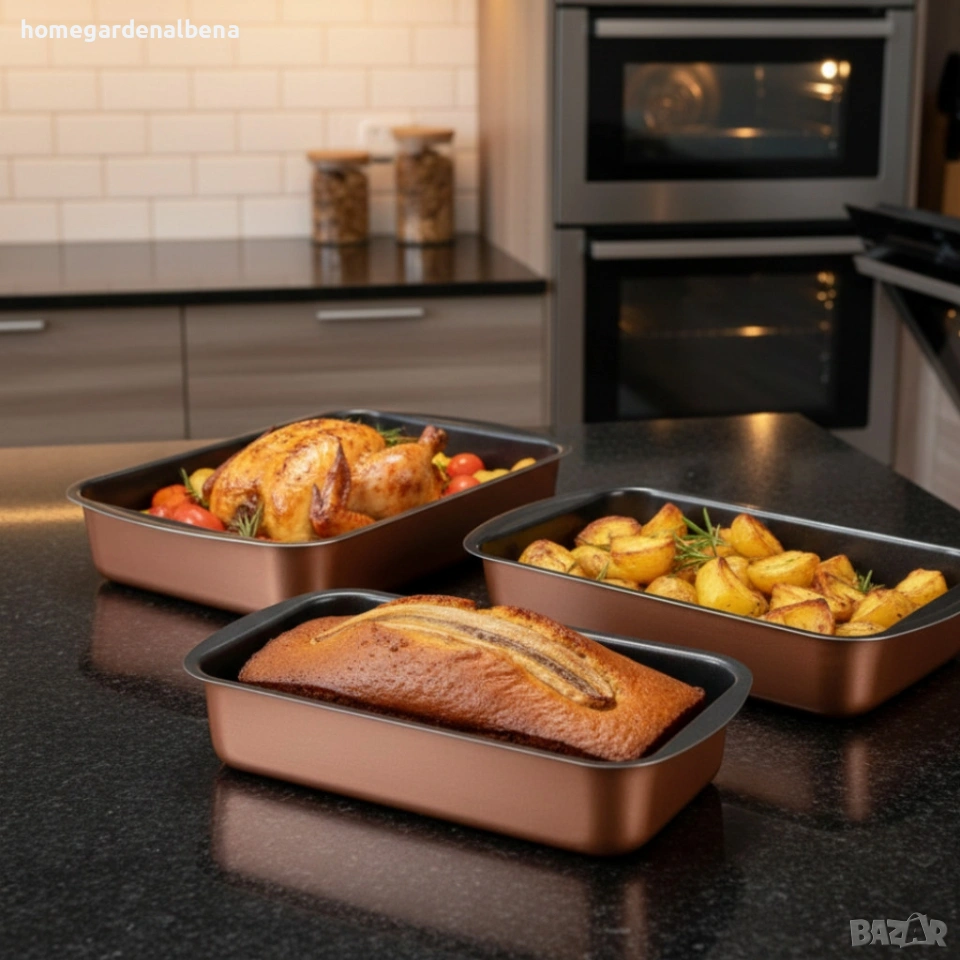 Трите размера покриват различни нужди: 33 × 14 × 7 см, 35 × 27 × 6 см и 40 × 28 × 7 см. Практичен детайл е, че тавите се събират една в друга, което спестява значително място в кухненския шкаф. Незалепващото покритие улеснява изваждането на готовите изделия и почистването след употреба.