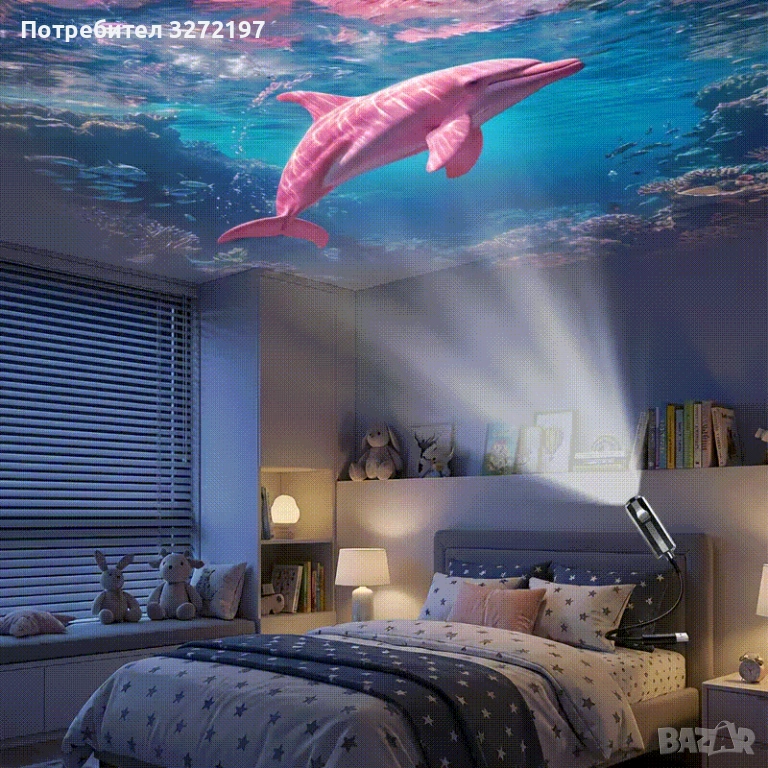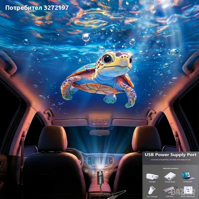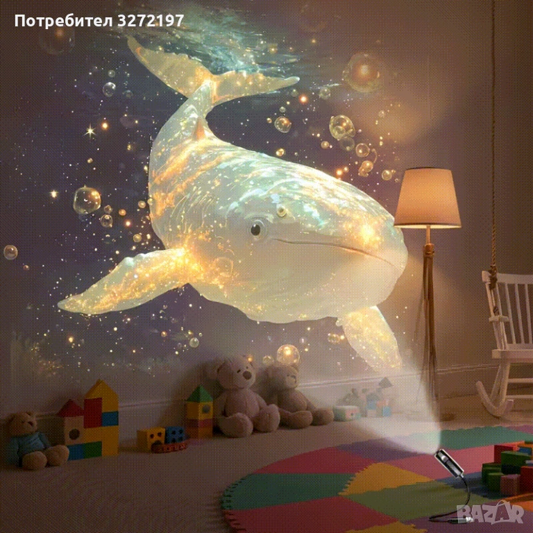 - LED със 4 сменяеми слайдовес океански изображения (кит,риба бета, делфин, костенурка)