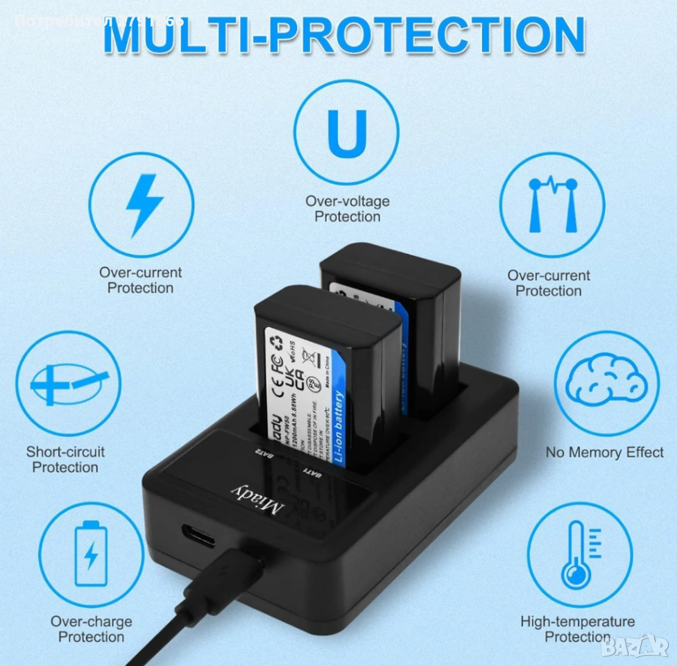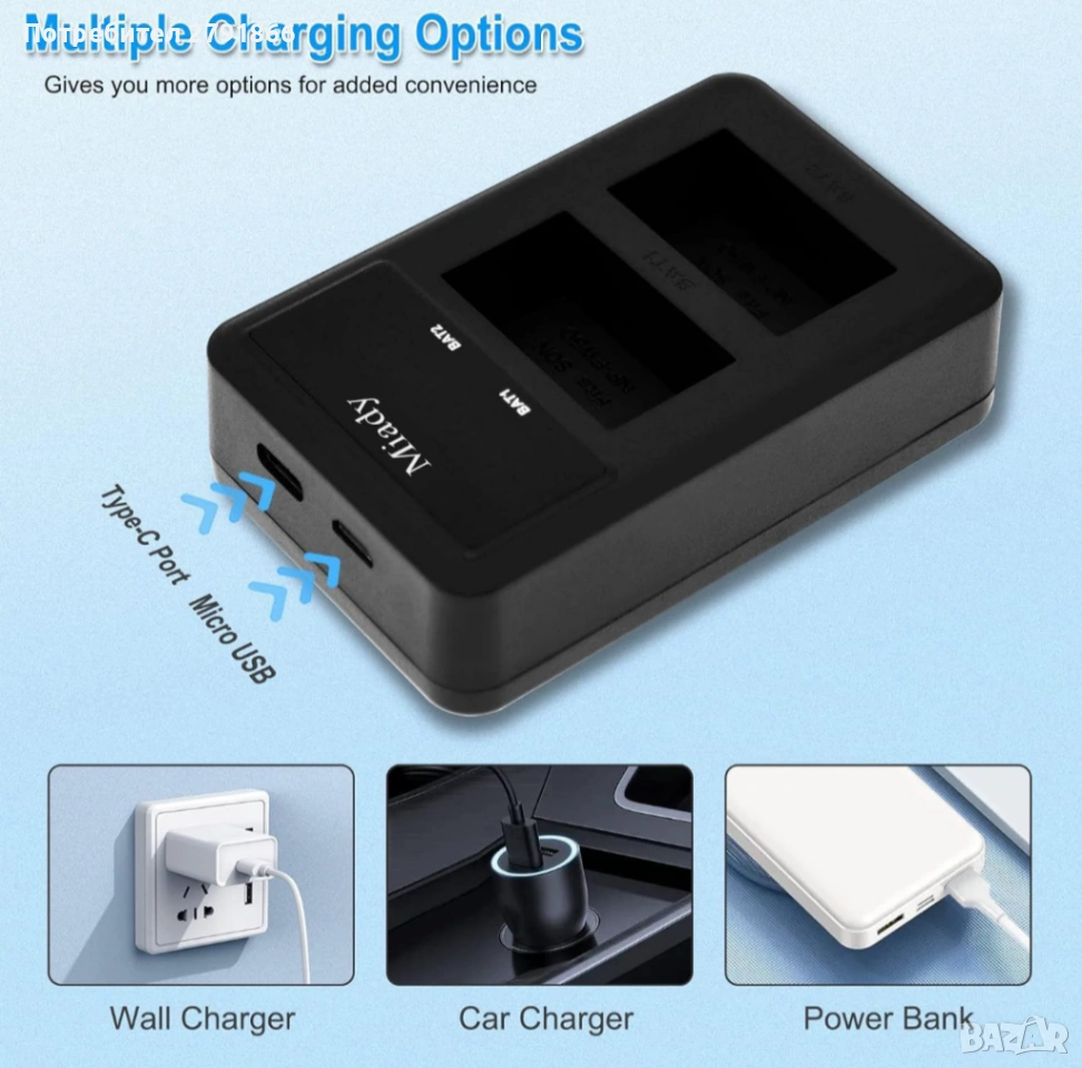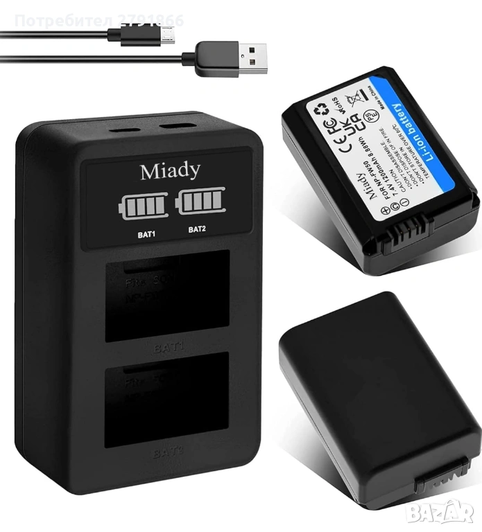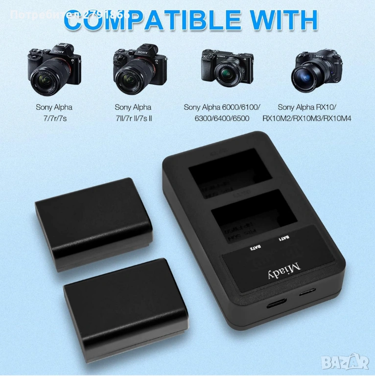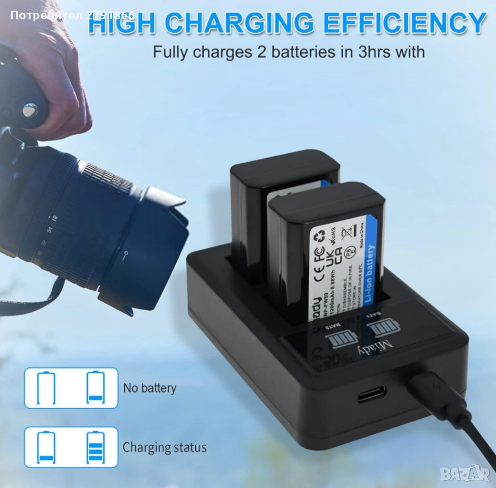 - Интелигентно зарядно устройство с LED дисплей: Вход: 5V/2A, Изход: 8.4V/0.6A*2. Може да зарежда 2 батерии NP-FW50 едновременно от всеки USB източник на захранване и да показва процеса на зареждане на LED дисплея, предотвратявайки презареждането на батерията.