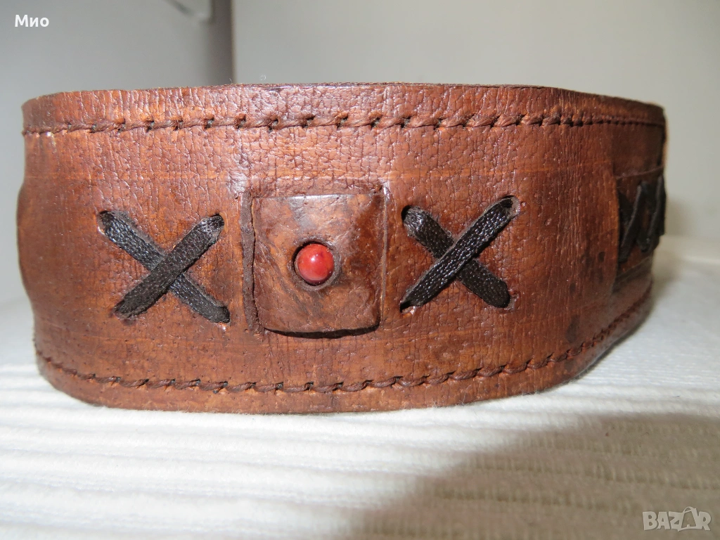 Нов колан с дължина на кожената част 106 см. Ширина 5 см. Външният слой и орнаментите са от естествена кожа. Разполага с 5 дупки. Камъчето от единия орнамент липсва.