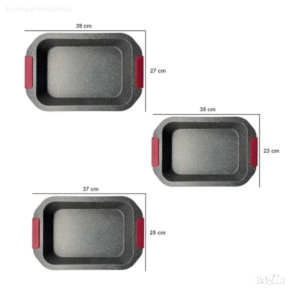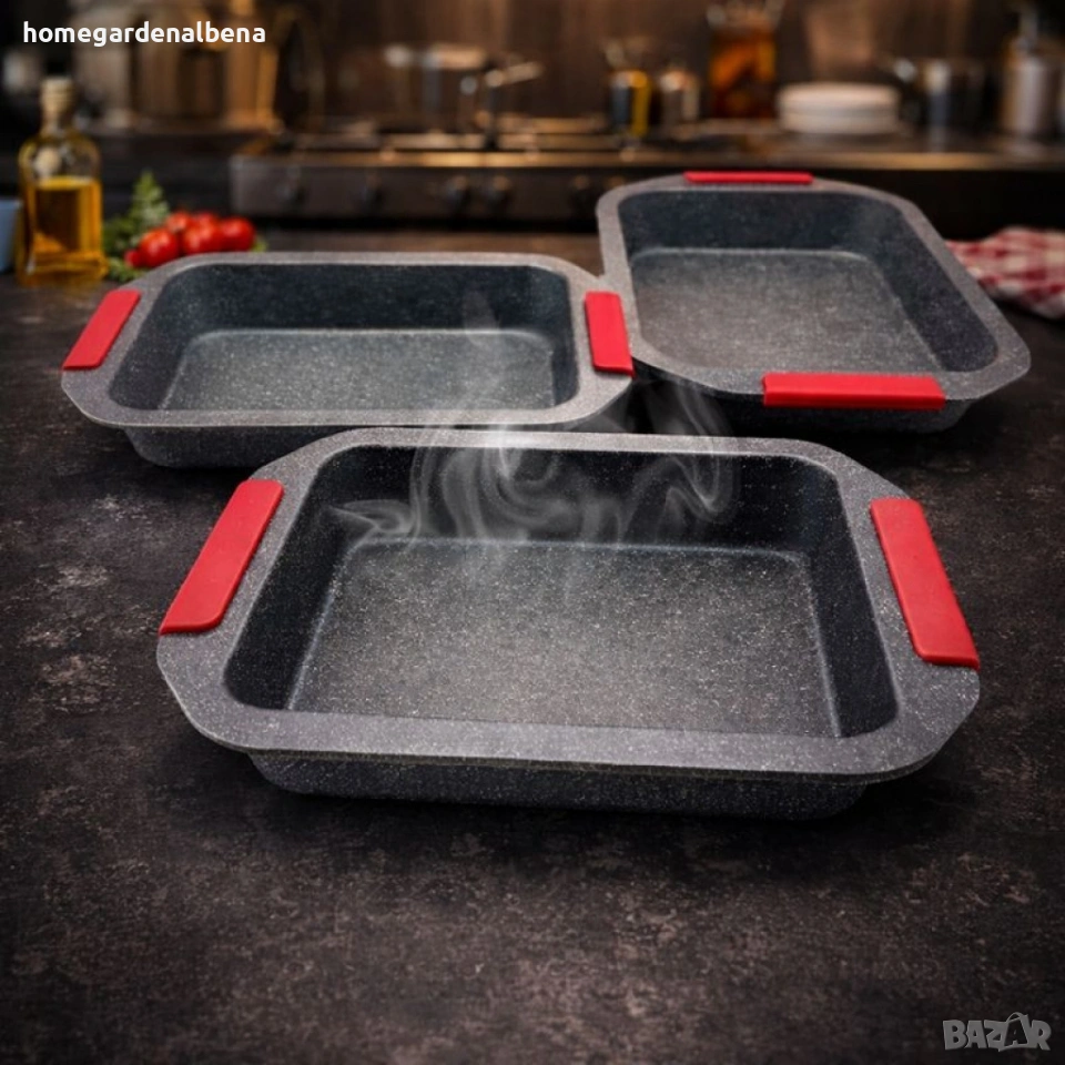 Практичен акцент са свалящите се силиконови дръжки, които улесняват работата с горещите тави и позволяват компактното им съхранение наредени една в друга. Комплектът включва три размера: малка (35 × 23 × 6 см), средна (37 × 25 × 6 см) и голяма (39 × 27 × 6 см) – подходящи за торти, пици, хляб, руладе и разнообразни ястия.