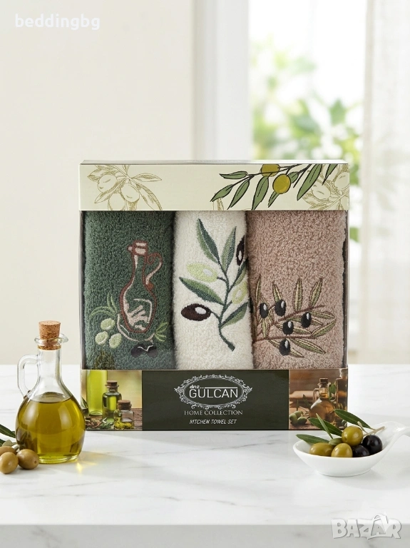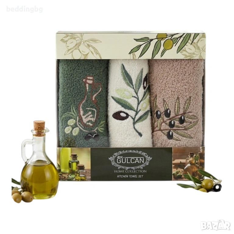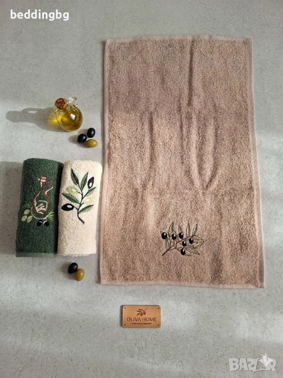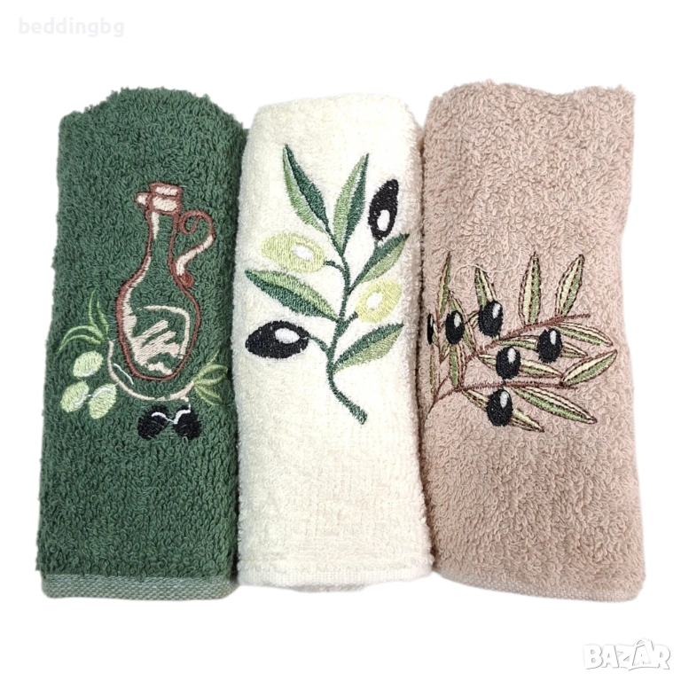 Комплект от 3 броя хавлиени кърпи за ръце и лице от серията "Olive Collection". Кърпите са изключително меки, плътни и със стилна бродерия, идеални за вашата кухня или баня, както и за изискан подарък.