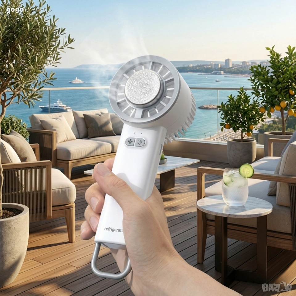 Преносим мини вентилатор 3в1 с полупроводниково охлаждане и леден компрес, 3 скорости, акумулаторна батерия 1800mAh, тих мотор Цена: 15 евро Охлаждане: Полупроводникова охлаждаща плоча (леден компрес), бързо понижение на температурата до около 10°C. Скорости: 3 нива (ниска/средна/висока), максимални 3500 об/мин, въздушен поток до 3,8 м/с. Батерия: Вградена акумулаторна батерия 1800 mAh; време на работа 5-6 часа при стандартна употреба. Шум: Тих мотор около 20 dB при ниски нива, удобно за нощна и офис употреба. Зареждане: Type-C порт за бързо и универсално зареждане. Функции: Ръчен, настолен и висящ режим (3 в 1), кука и стойка за различни ситуации.