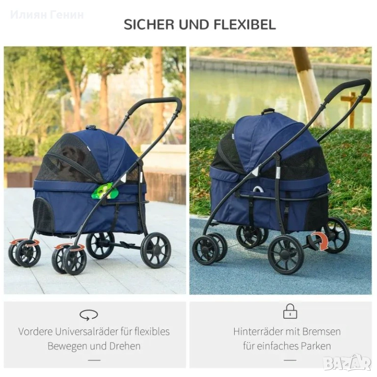 Иновативен дизайн: Благодарение на лесно сгъваемия си дизайн, тази количка за котки е преносима и лесна за съхранение, така че можете да я вземете със себе си, когато пътувате, пазарувате или сте на разходка с домашния си любимец. Количката може да се отдели и да се използва отделно като кошница – вземете котката си на приключения в котешката количка или чанта.