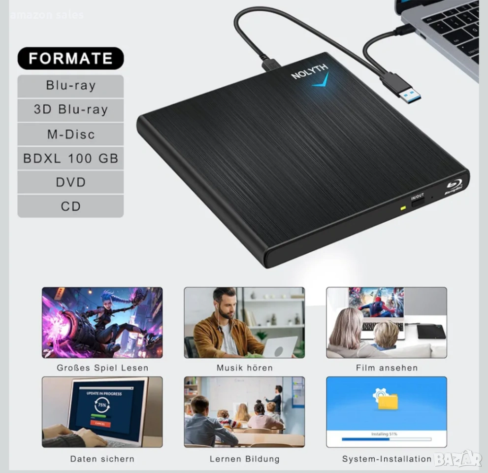 NOLYTH Blu-ray/DVD/CD външно устройство за лаптоп Mac PC Windows MacBook четене/запис Plug and play