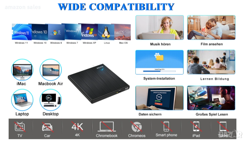Външното Blu-ray устройство NOLYTH е съвместимо с множество операционни системи, включително Windows 11/10/8.1/7/XP, Linux и всички версии на Mac OS, така че можем да използваме това Blu-ray записващо устройство външно на почти всички компютри, включително MacBook Pro/Air, iMac, Mac mini, лаптопи и настолни компютри с Windows (забележка: Това външно Blu-ray CD DVD устройство не поддържа Chromebook, телевизори, таблети, iPad, 4K, мобилни телефони, проектори, камиони и автомобили).