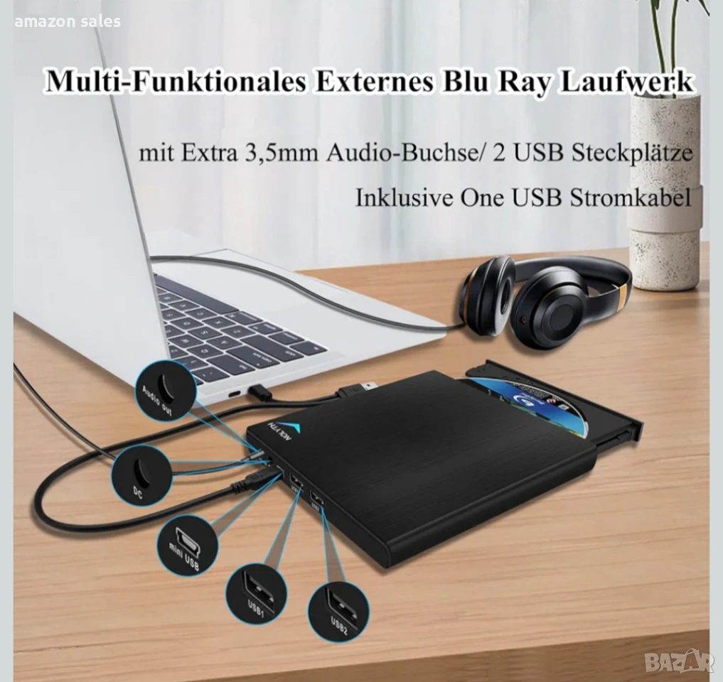 - Многофункционално външно Blu-ray записващо устройство: това външно Blu-ray устройство има 2 USB порта, 1 аудио жак и 1 USB захранващ кабел. То ефективно решава проблема с недостатъчните USB портове на вашия компютър. Благодарение на аудио жака, можем да се наслаждаваме на 3,5 мм аудио стерео звук за филми/музика, да споделяме щастие със семейството/приятелите си или да не безпокоим другите, докато използваме това външно Blu-ray записващо устройство.