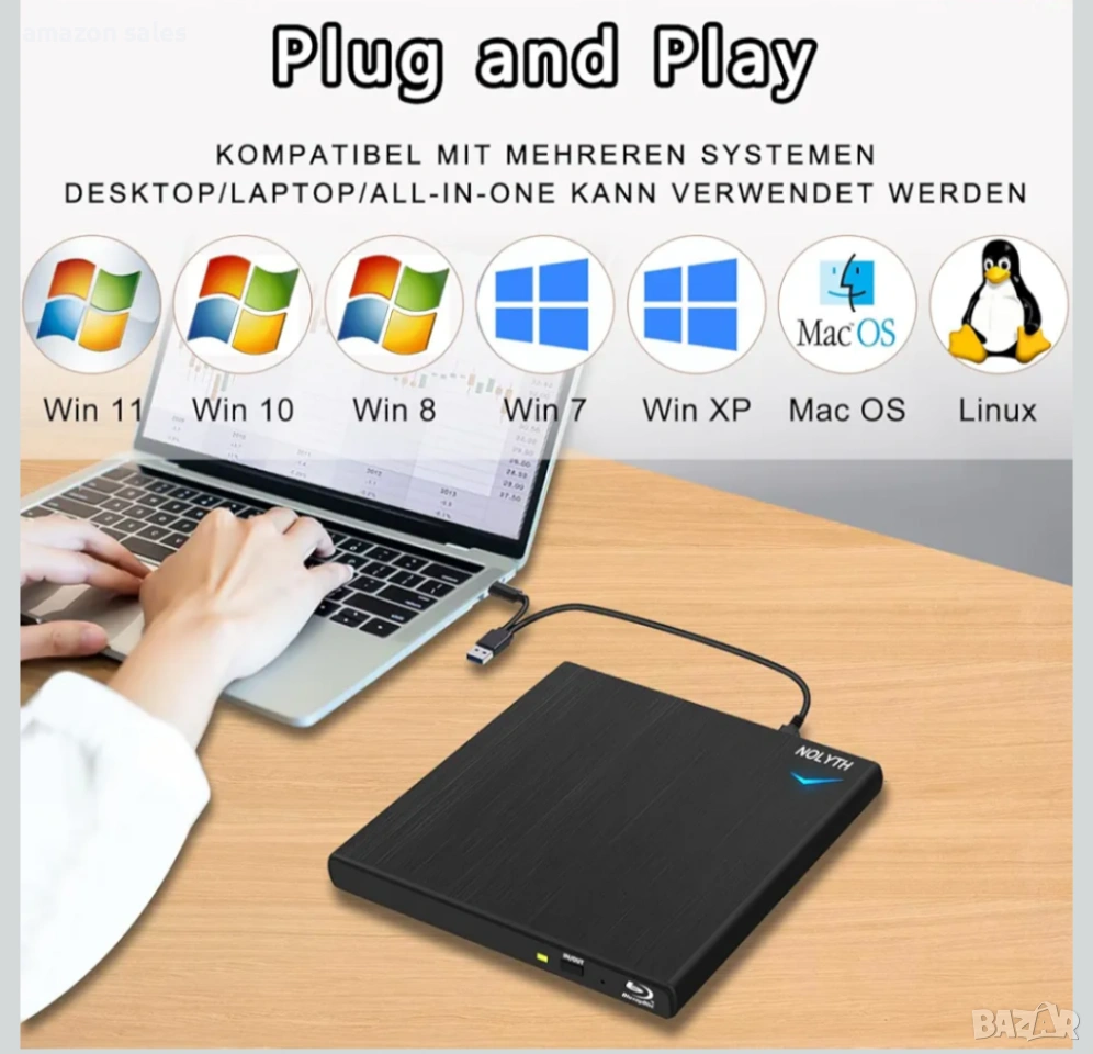 - Широка съвместимост: Външното Blu-ray устройство NOLYTH е съвместимо с множество операционни системи, включително Windows 11/10/8.1/7/XP, Linux и всички версии на Mac OS, така че можем да използваме това външно Blu-ray устройство на почти всички компютри, включително MacBook Pro, MacBook Air, iMac, Mac Mini, лаптопи и настолни компютри с Windows (Забележка: Това външно Blu-ray устройство не поддържа Chromebook, телевизори, таблети, врати, камиони и автомобили).