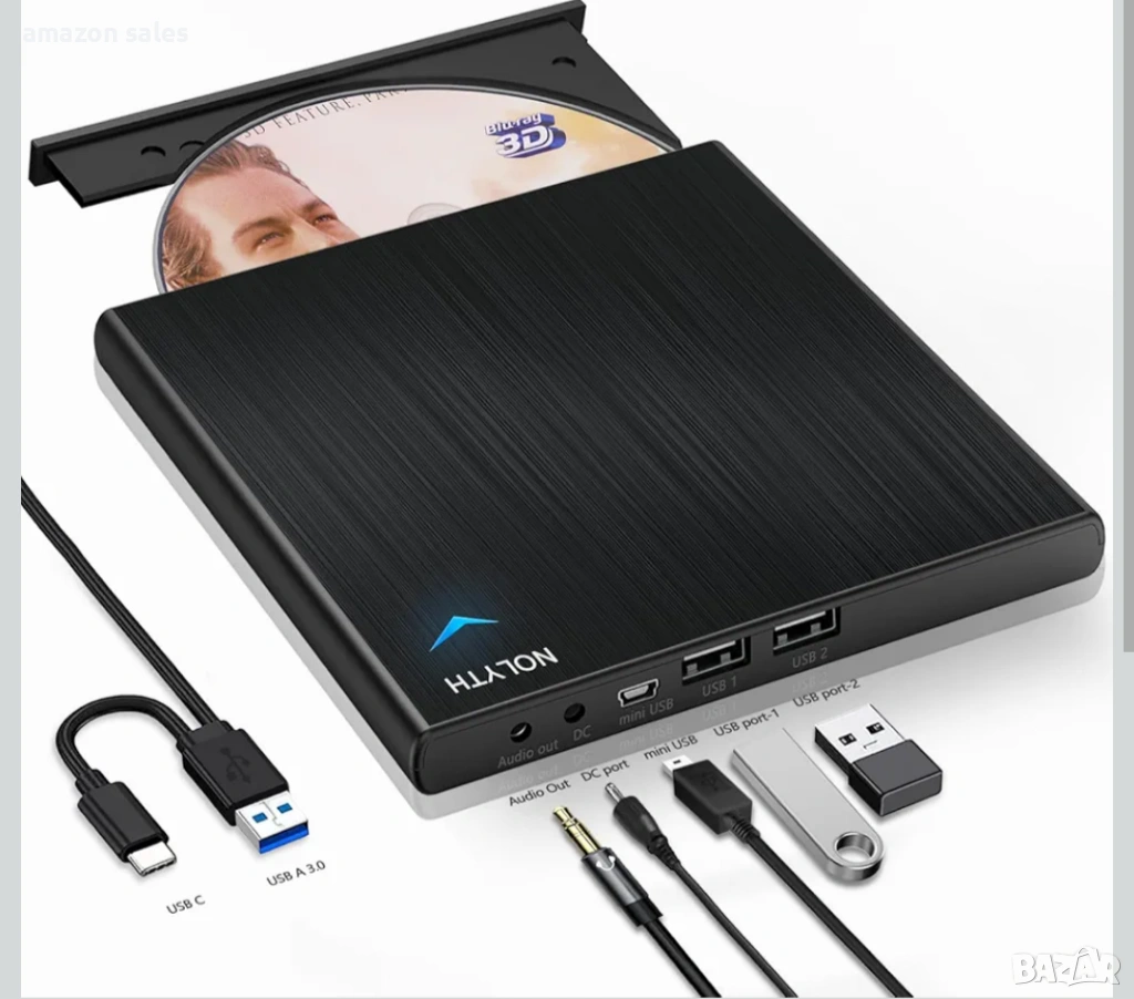 Външното Blu-ray устройство NOLYTH е многофункционално Blu-ray устройство, което има 3,5 мм аудио порт, 1 захранващ порт и 2 USB порта. Това външно Blu-ray устройство се предлага и с 1 USB захранващ кабел и 1 кабел за данни.