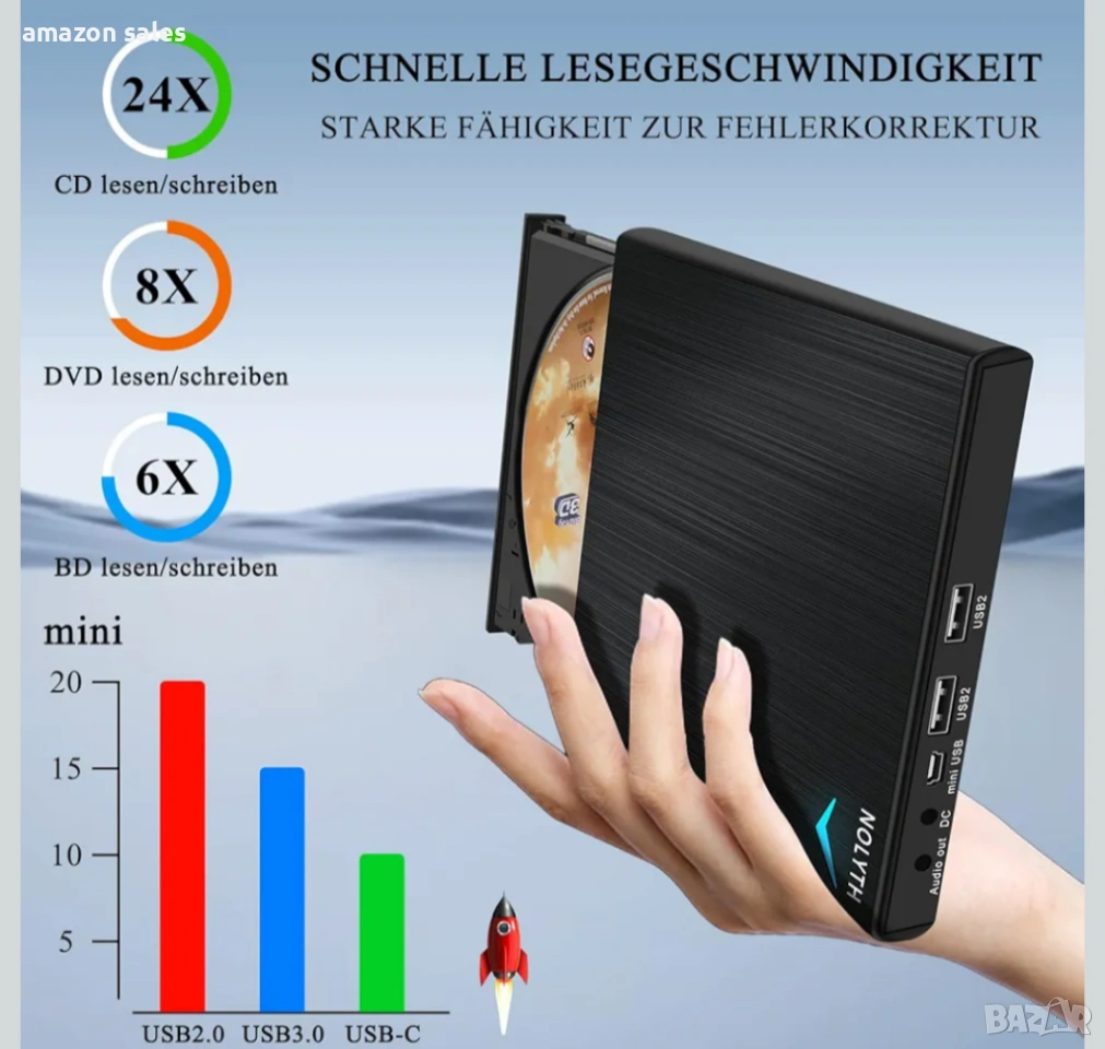 - Външно Blu-ray устройство за четене/запис: Външното Blu-ray устройство NOLYTH поддържа четене и запис на Blu-ray дискове/DVD/CD. Скоростта на четене на Blu-ray е до 6x, на DVD до 8x, а на CD до 24x. Можете да използвате софтуера за различни задачи, като например гледане на DVD/BD филми, слушане на музикални CD-та, запис на CD/DVD/BD дискове, инсталиране на софтуер/система/игри, архивиране на данни на дискове и други. Това външно Blu-ray устройство е най-добрият избор за гледане на 3D филми за цялото семейство.