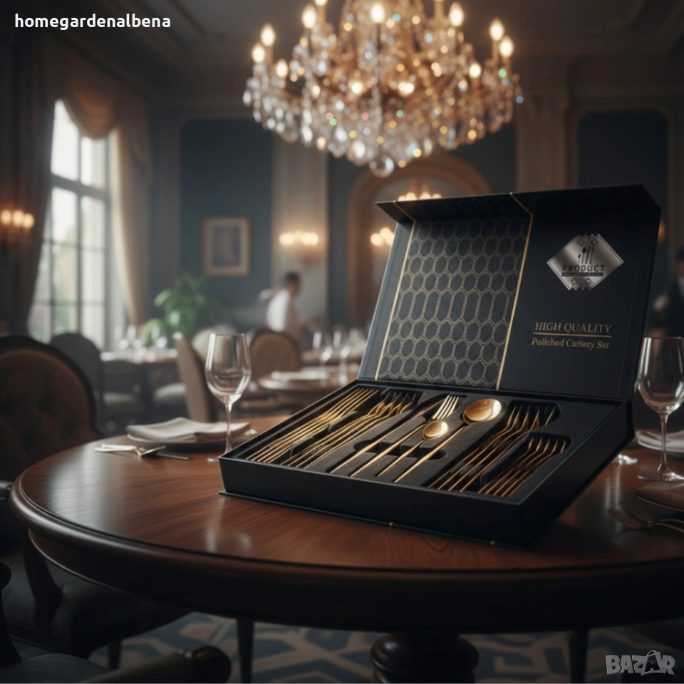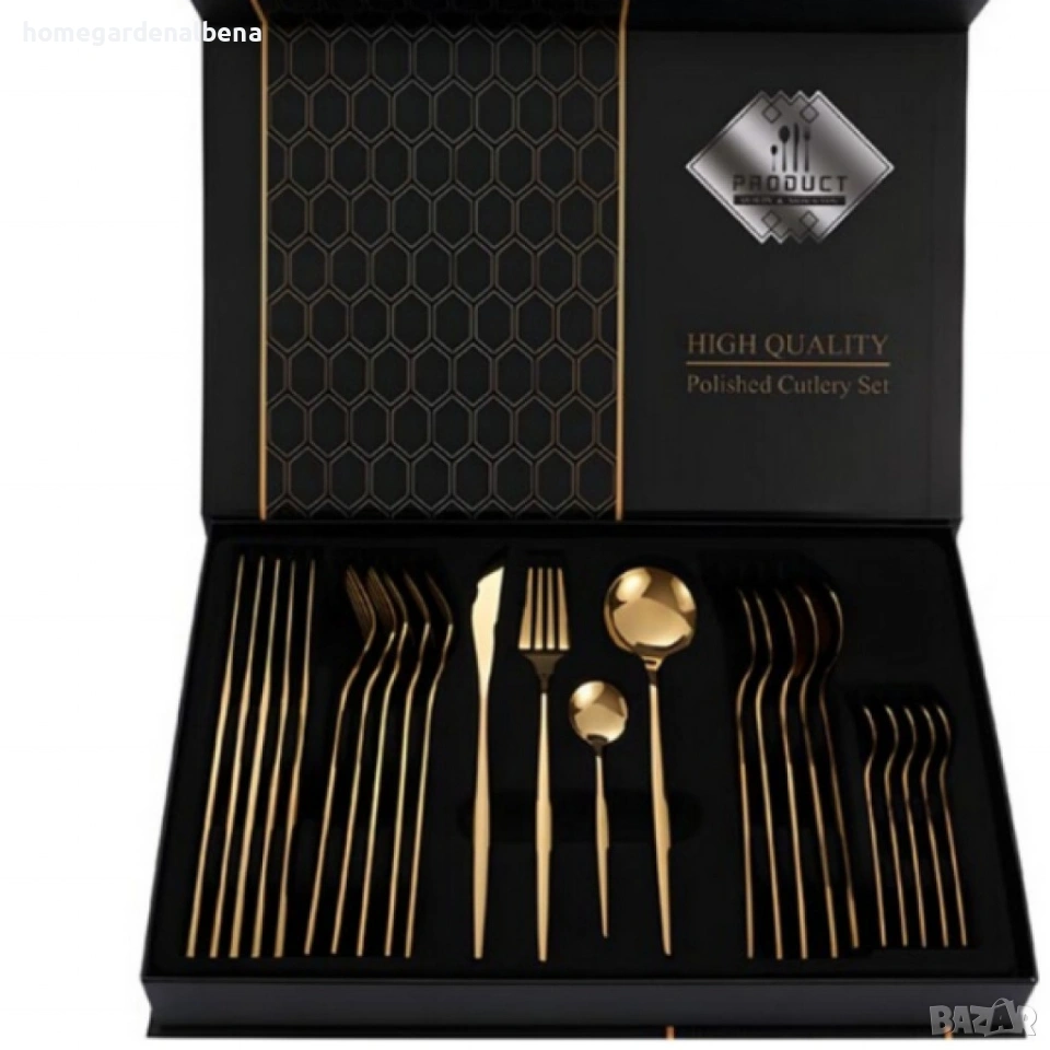 Комплект прибори за хранене в златист цвят от 24 части с луксозен дизайн и магнитна кутия