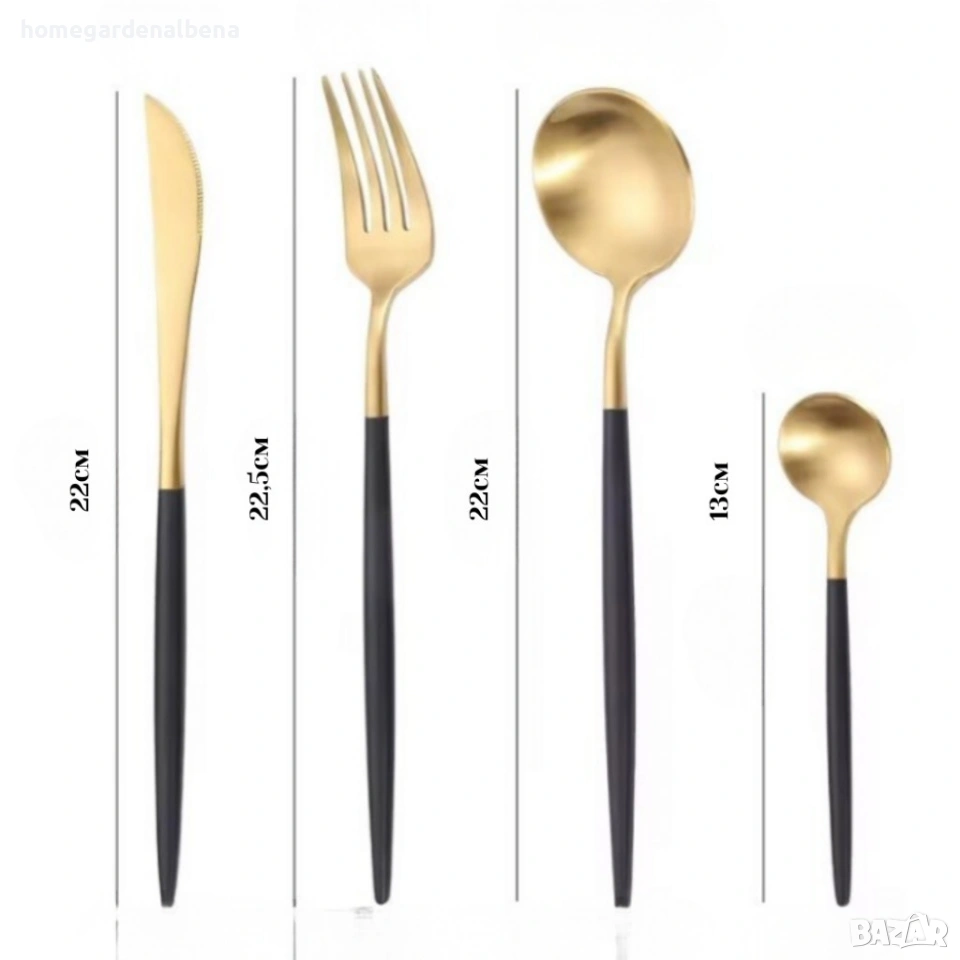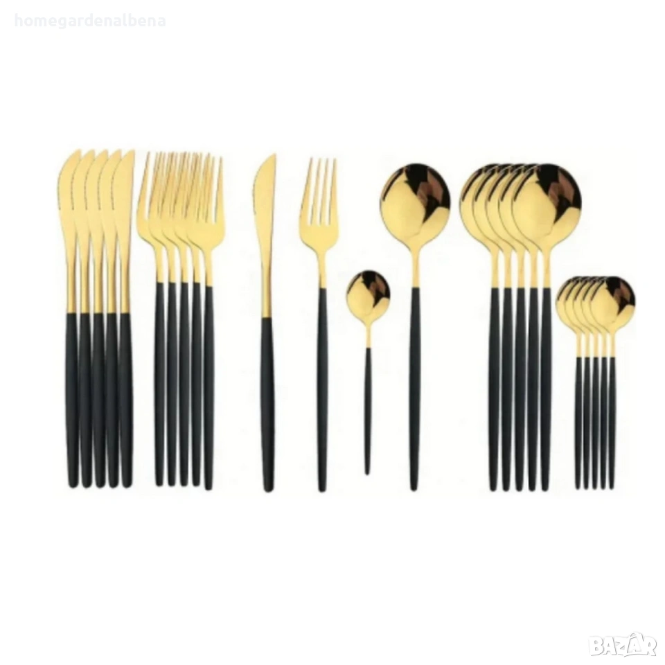 Ключови думи: комплект прибори хранене, неръждаема стомана прибори, прибори 24 части, златисто черно прибори, луксозни прибори подарък, магнитна кутия прибори, прибори за 6 души, прибори сватба подарък новосел