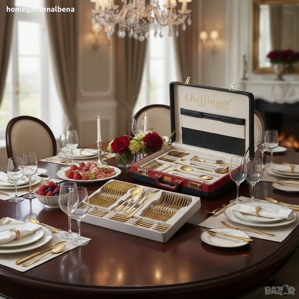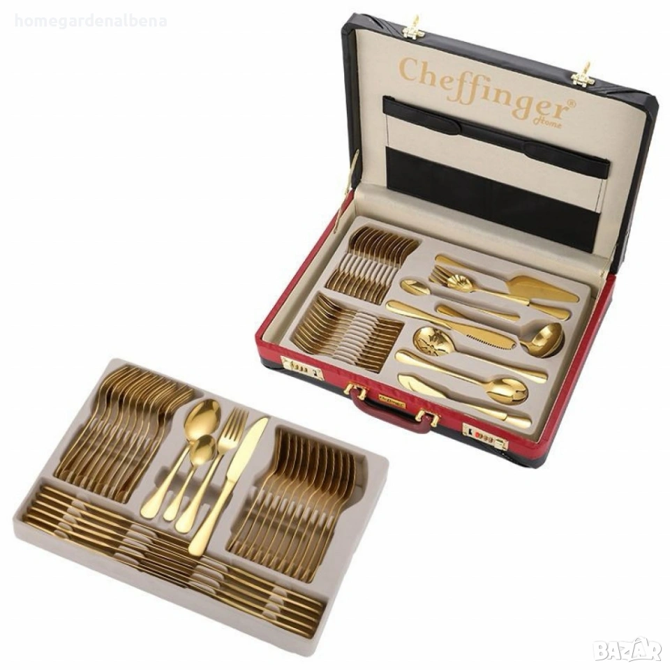 Ключови думи: прибори комплект, комплект прибори 72 части, луксозни прибори, златни прибори, сребърни прибори, прибори Cheffinger, прибори с куфар, кухненски прибори, комплект за хранене, подарък комплект прибори, HOME & Garden by Albena